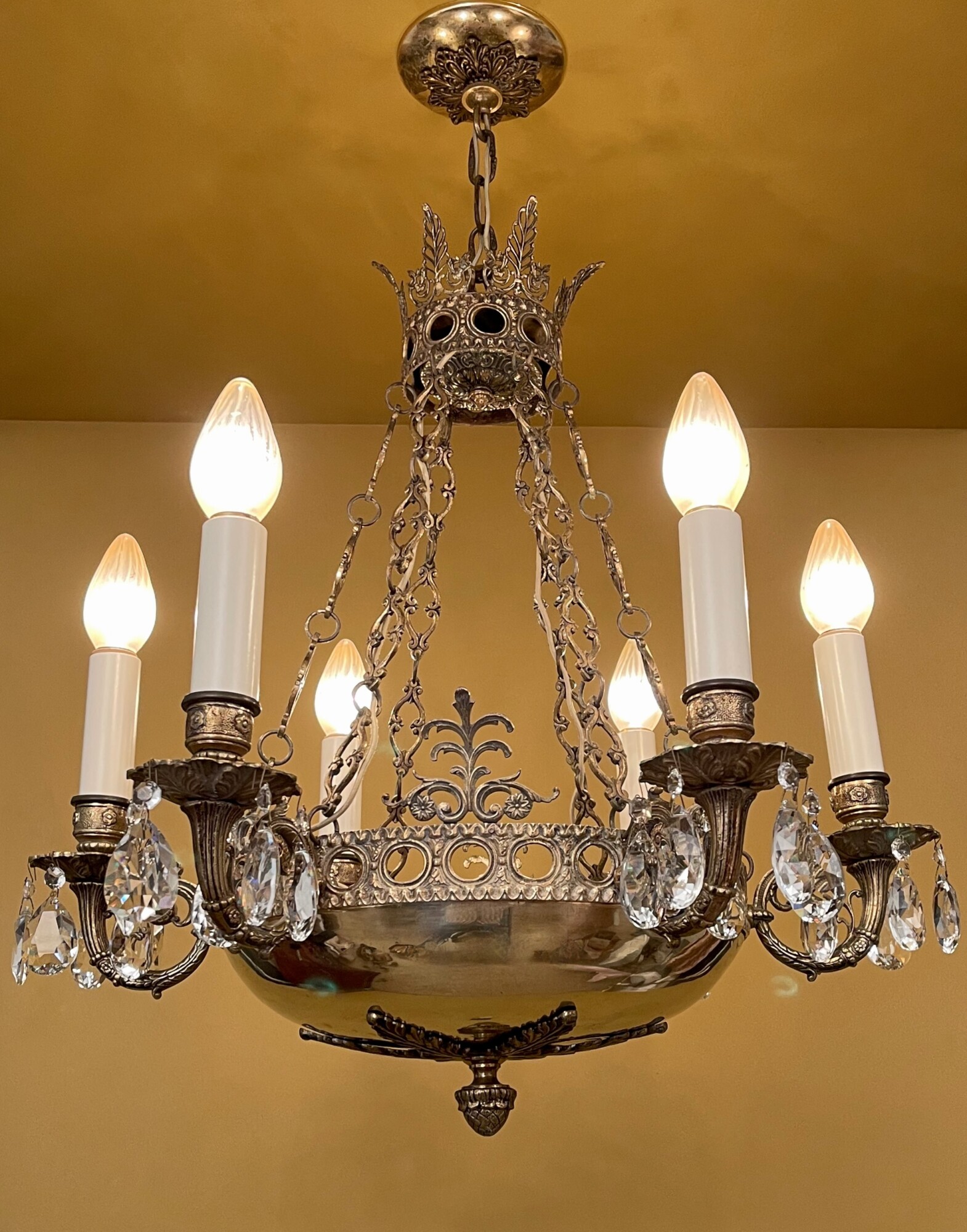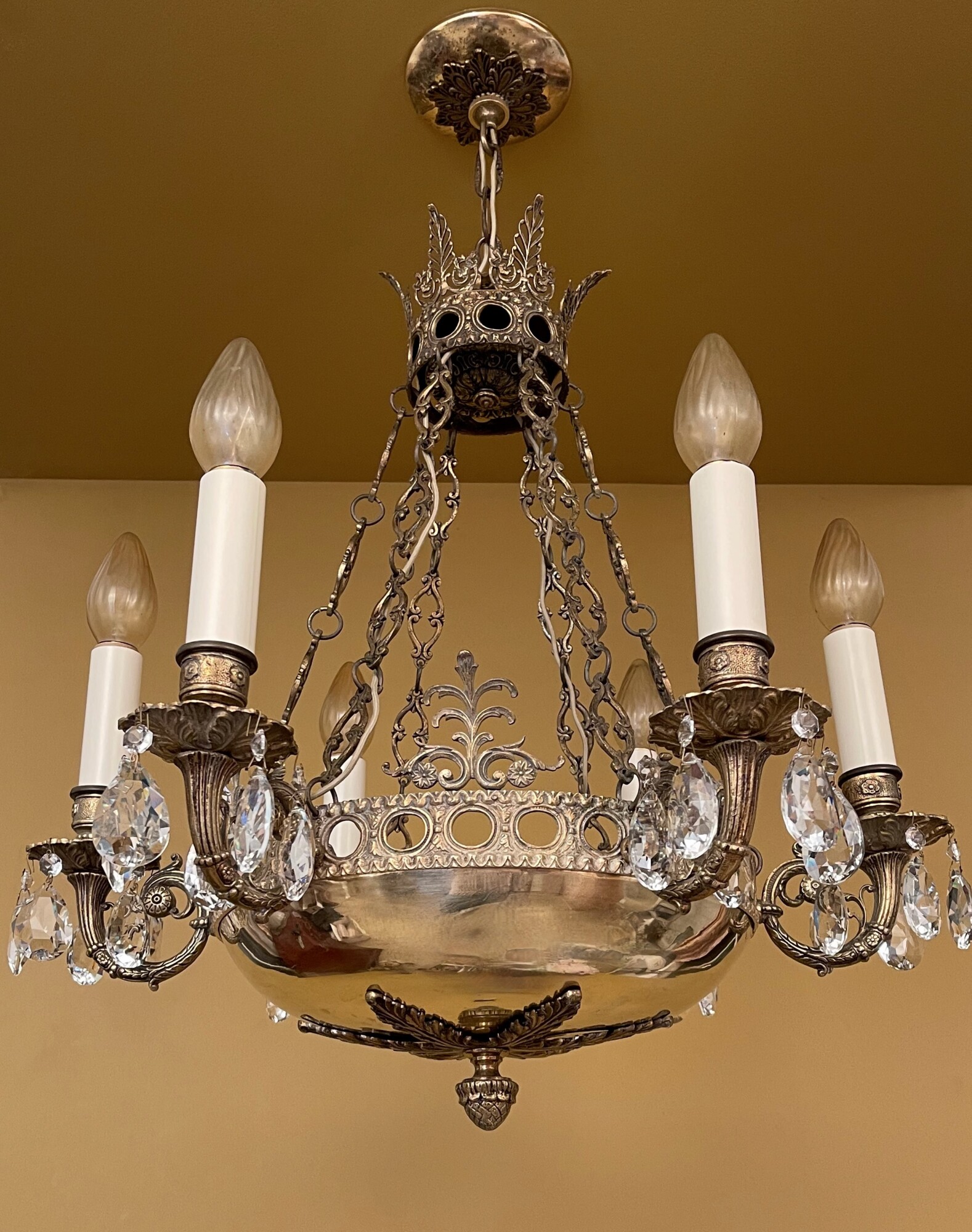 My appreciation of the fixture though was largely based after I restored it. For, the few online Facebook pictures had showed a sad-looking thing. The bottom brass bowl was spray-painted gold. Huh? I stripped and polished this. The candles were weirdly stumpy. I changed them for 6-inch candles. Much better! I carefully polished while retaining most of the patina. The crystals were…oh, the horror…pressed glass. I replaced them with hand-cut crystals.
