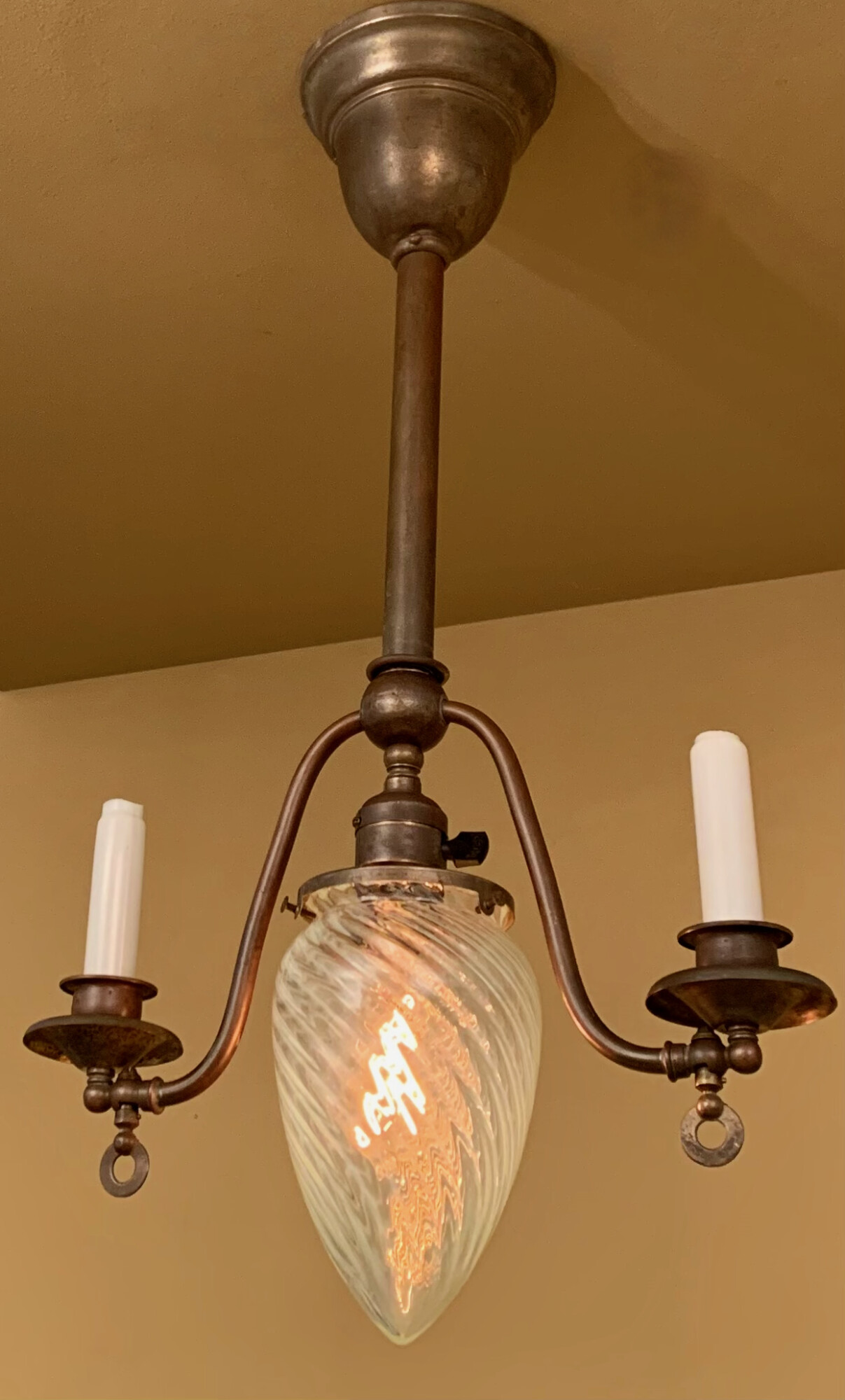 That is a nice fixture. I thought of you recently when we spent a night in the Vrooman Mansion B & B in Bloomington, IL. A nice old Italianate pile. The last owner passed away with most of the furnishings left in the house, so a lot of the original fabric of the place is intact. But, the reason you might be interested is that almost all of it’s gas/electric fixtures are still in the house! Wall sconces, ceiling pieces, all there! One additional cool thing is that they have the trunk/luggage lift still operational in the service area. Very fun!