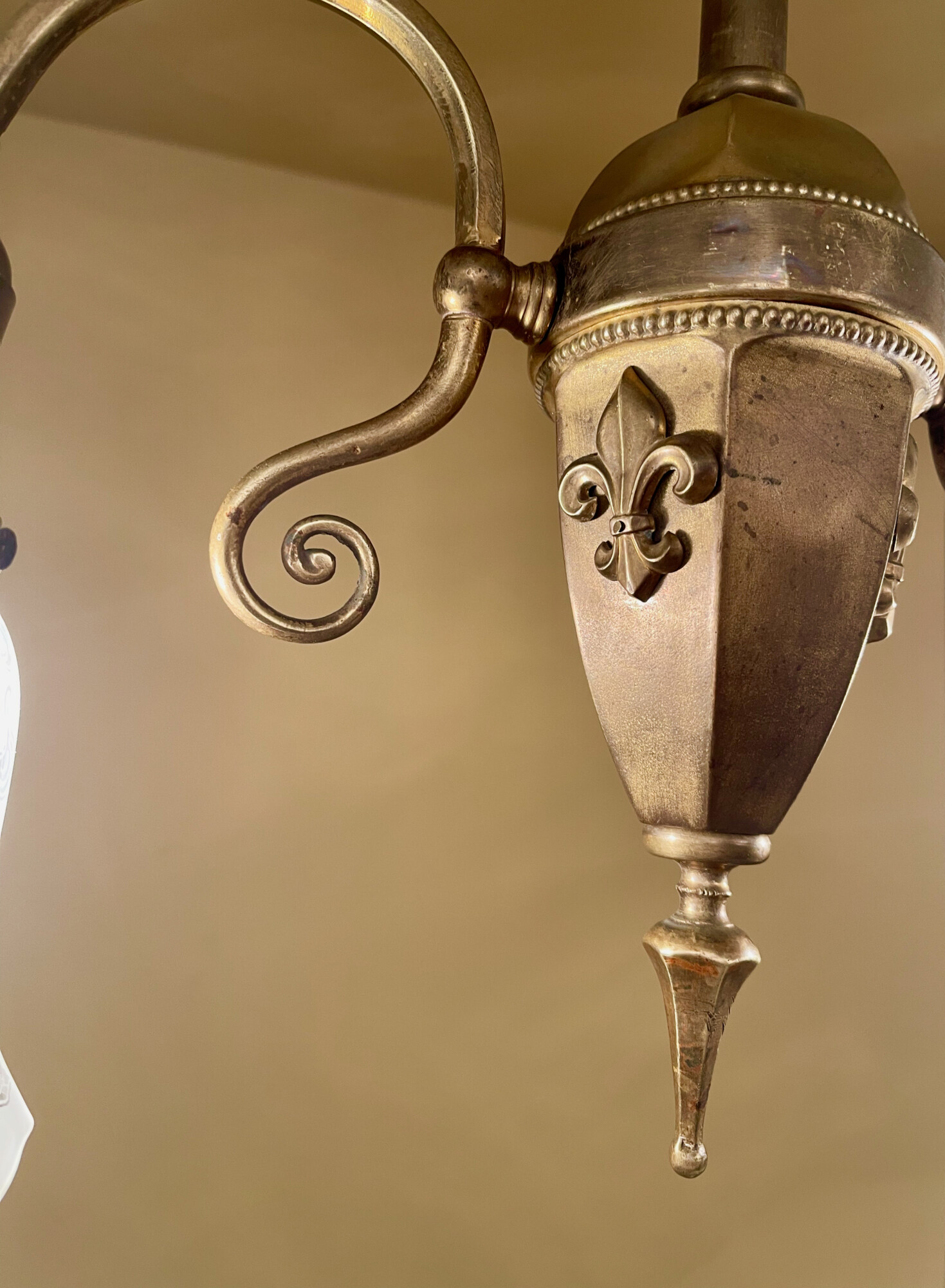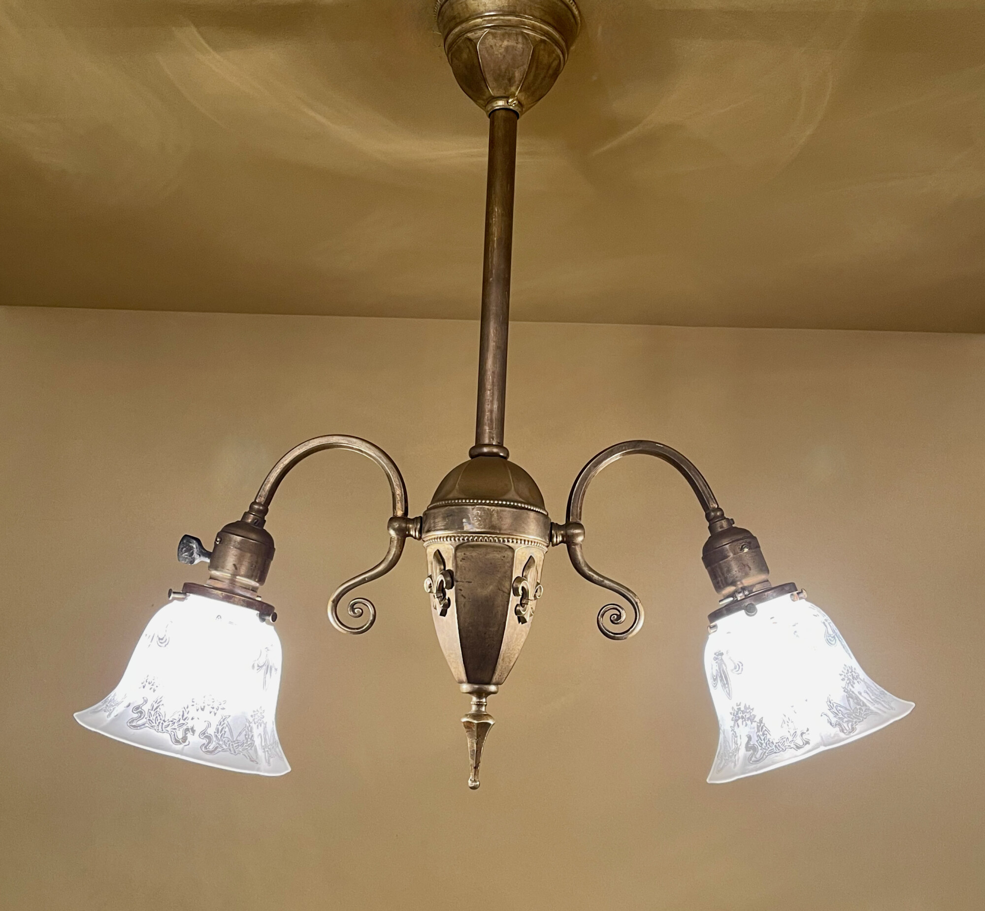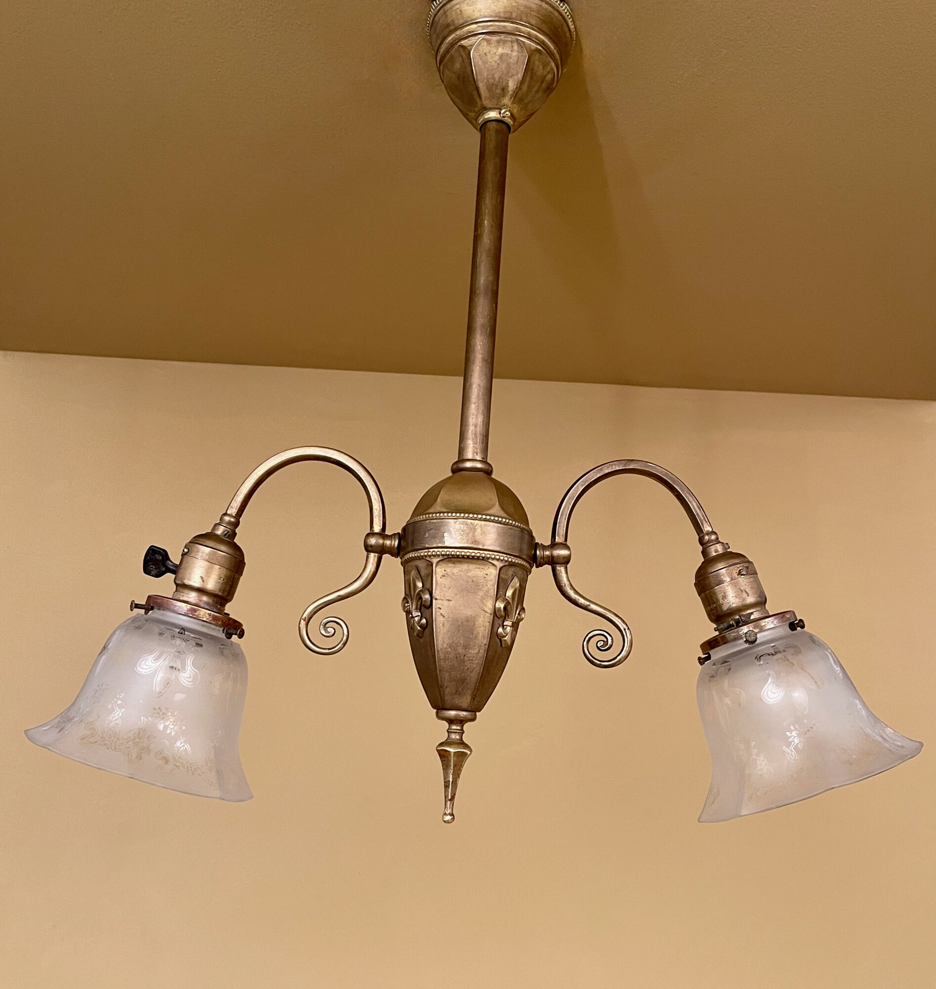 A circa-1900 Early Electric brass pendant.