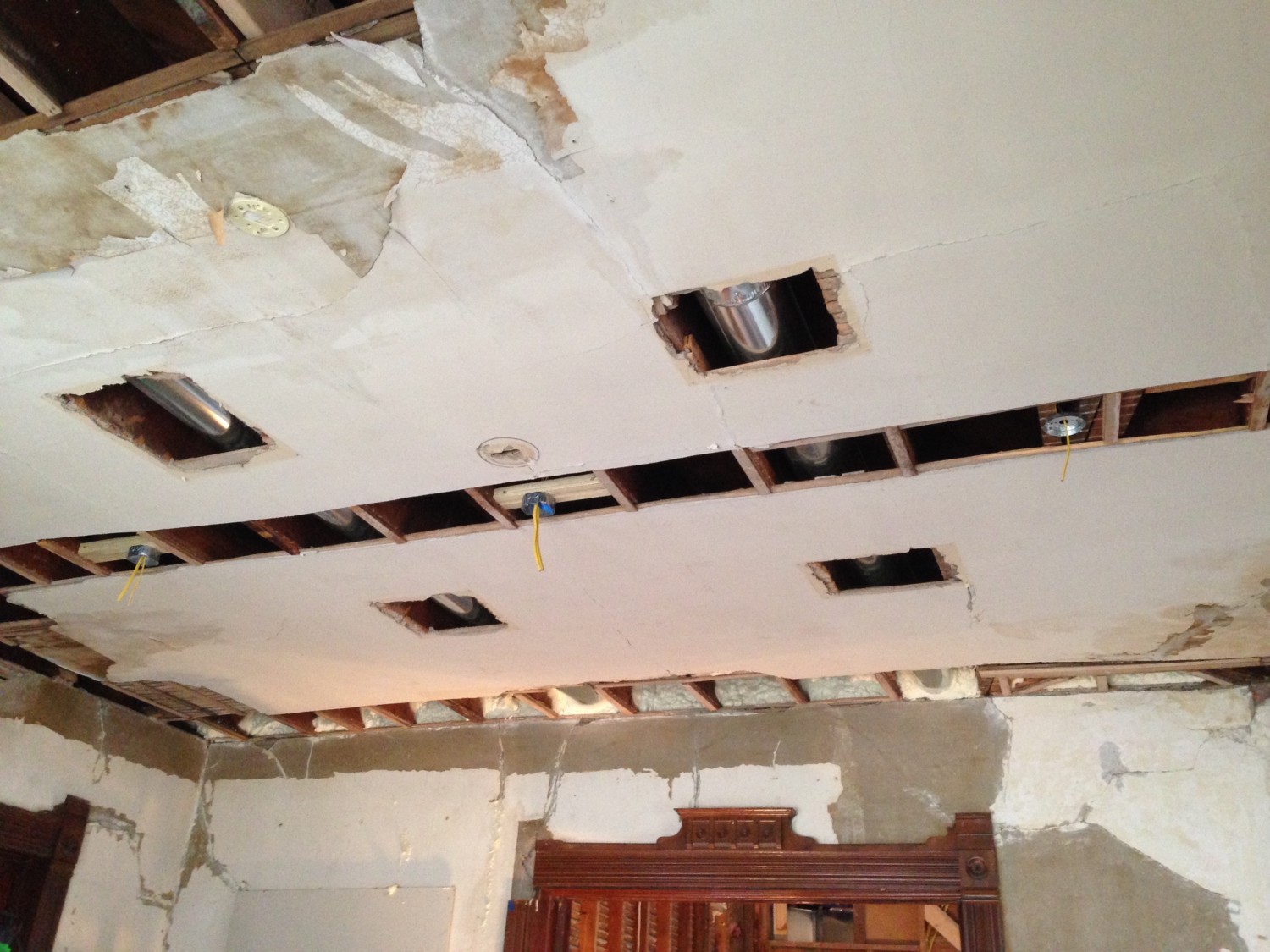 November, 2014. You can see the bottom of the new steel I-beam. Note the trim, darkened from decades of old shellac.