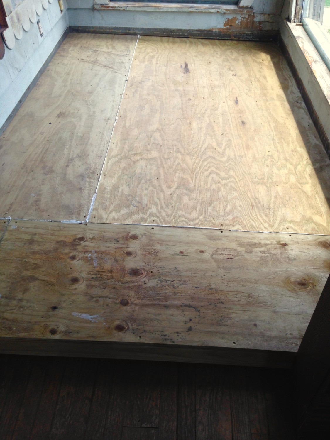 Because I had no idea of what the original flooring was, I recreated the original floor level, but out of waterproof plywood. This I will sand and paint.