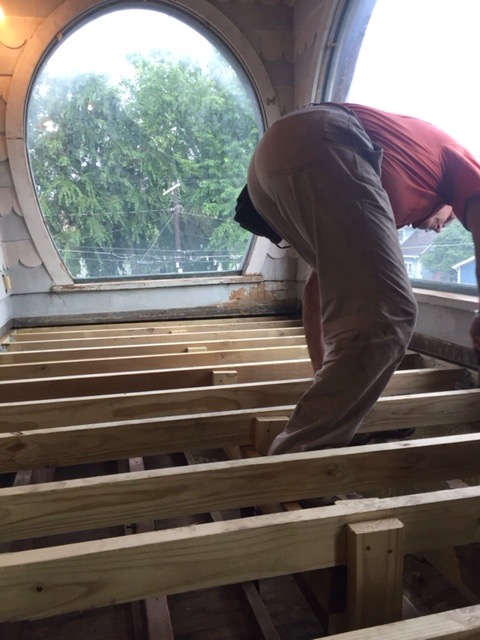 In removing the non-original flooring to the second-floor porch, we discovered that there were two layers. The top layer was oak, and this was contiguous with the adjacent Sewing Room. Under the oak, was this pine floor. The pine floor was clearly salvaged, and roughly installed as a subfloor for the oak.