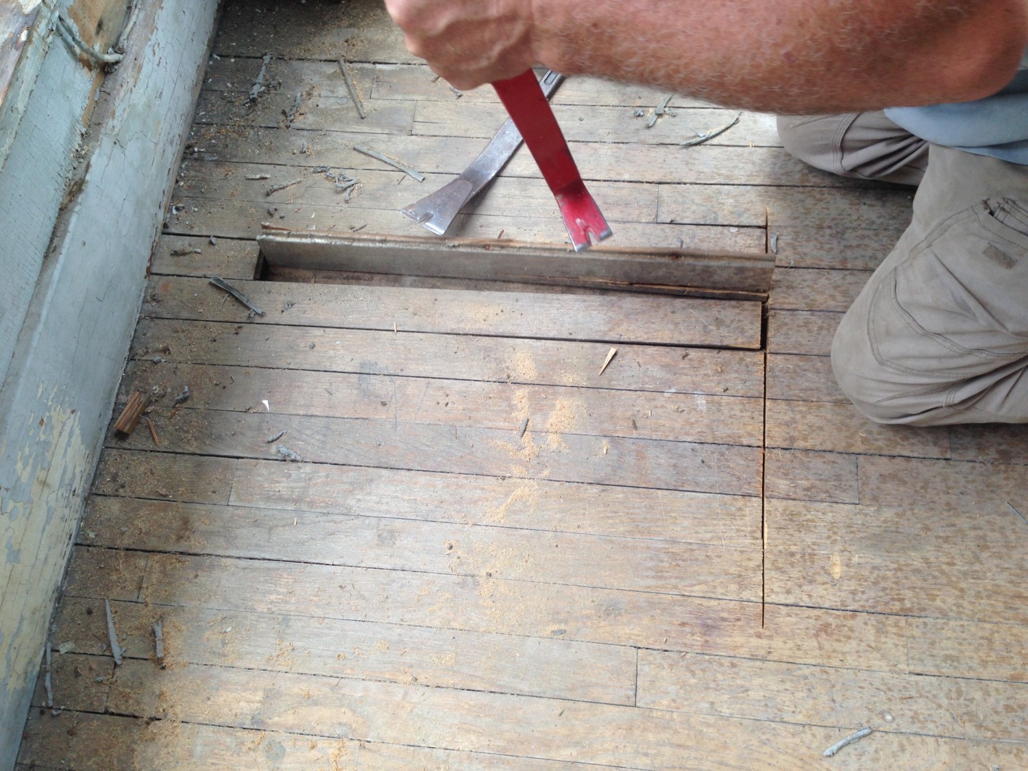 When the porch was enclosed it had a new floor installed, which appears to date from 1950, and is contiguous with the adjacent Sewing Room. So, was the porch enclosed in 1950, when the house converted into a motel? Or was the oak floor from 1929 when the house was converted into apartments? In any event, I knew the original porch floor would be under the later floors, and assumed it would be squares of galvanized tin soldered together. Or something.