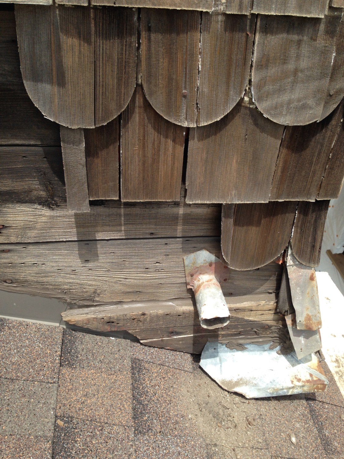 There is horizontal trim BELOW the shingles. This what I called the STAR trim (because I put a star next to it in one of my drawings). The BOTTOM of this trim is not level, and this is where the original, non-level floor was.