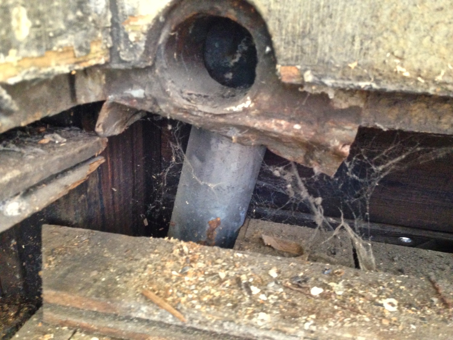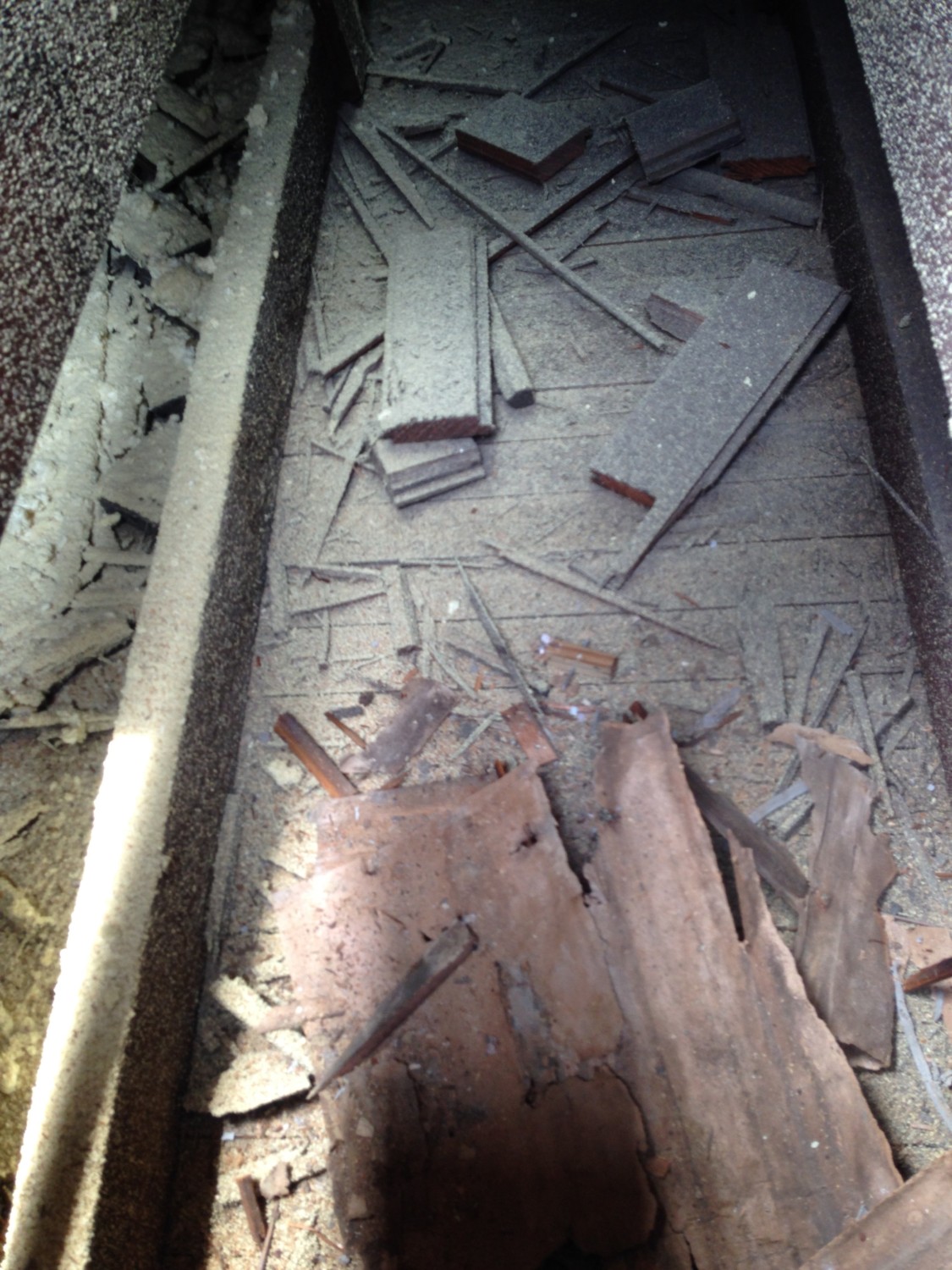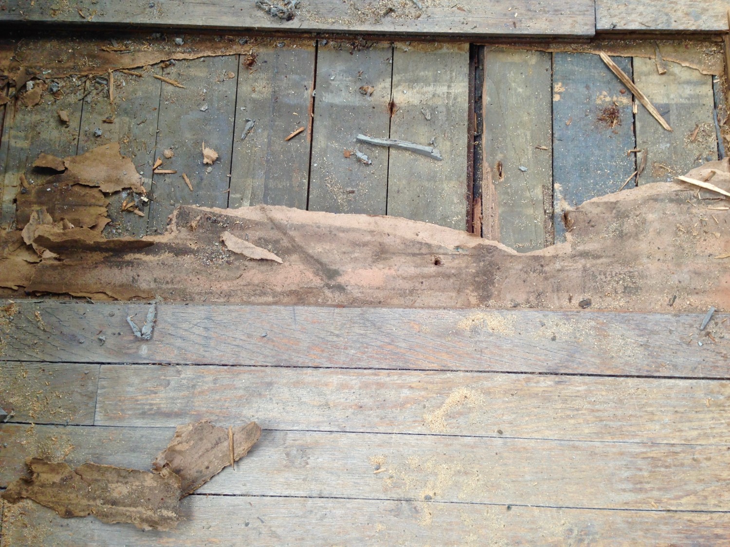 Two feet BELOW the oak floor was the wood ceiling of the porte-cochère, and layered with a lot of debris. Huh???????? This debris did not appear to be original (no self-respecting builder would leave such a mess).