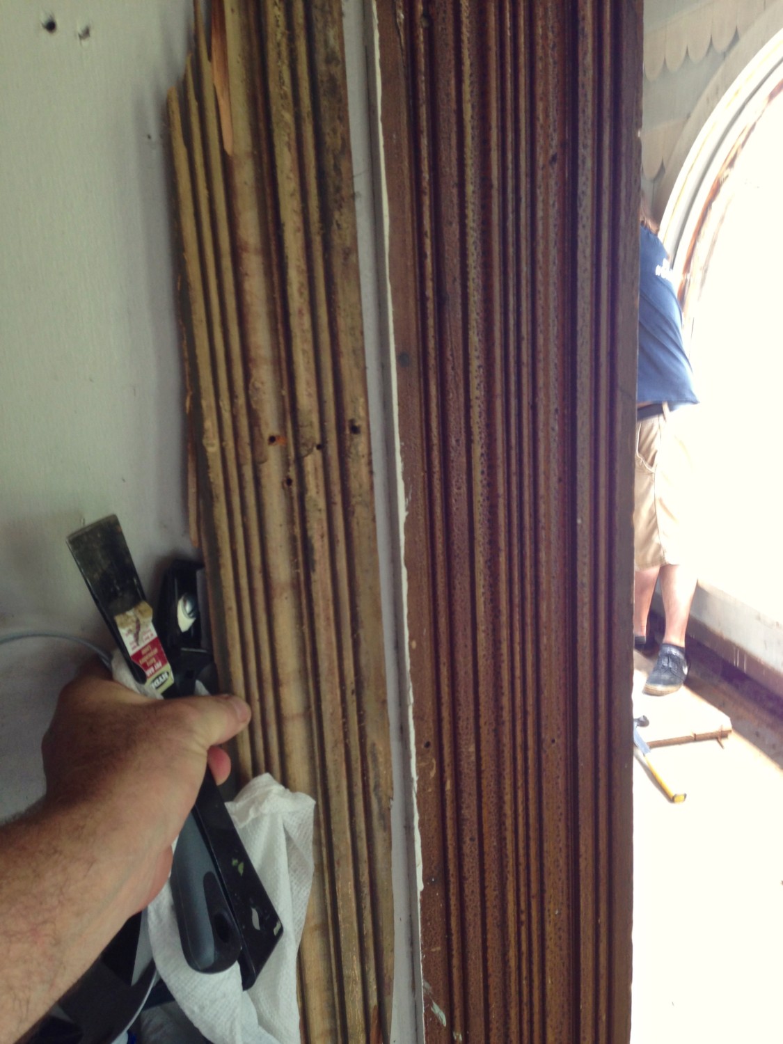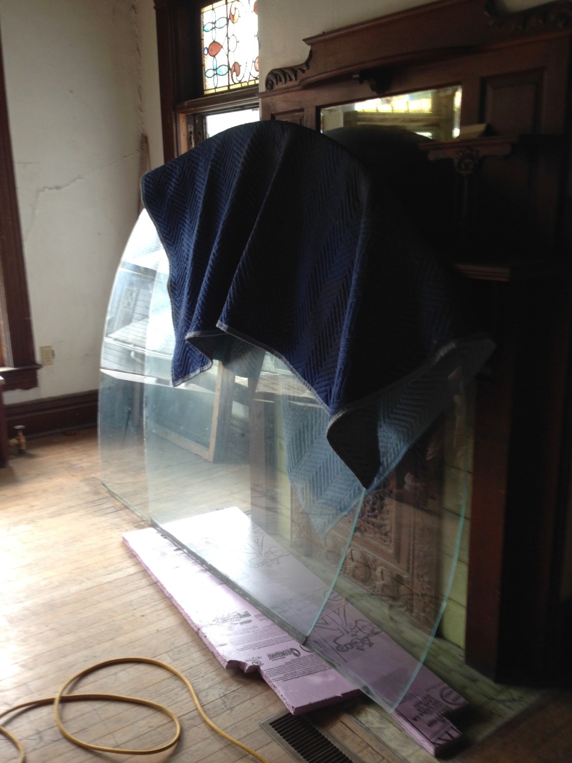 However, removing the glass has not been a priority item. Fantasies be damned! Yesterday though, it suddenly jumped to the top of the list because we needed to jack up a sagging corner to repair a very old gutter issue, as detailed in my previous post. We were afraid that the big sheets of glass in the arched openings would shatter during the process, so they had to come out…