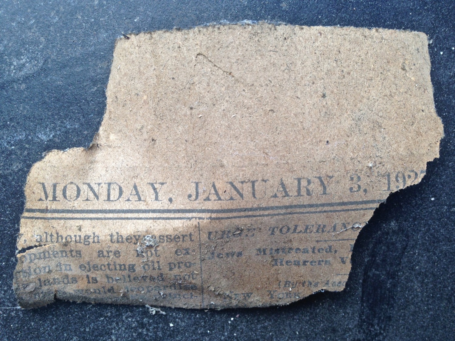 We removed the non-original base. It came off pretty easy. Behind it we discovered this newspaper fragment. It appears to be dated 1927. A clue? Or just an old bit of newspaper?