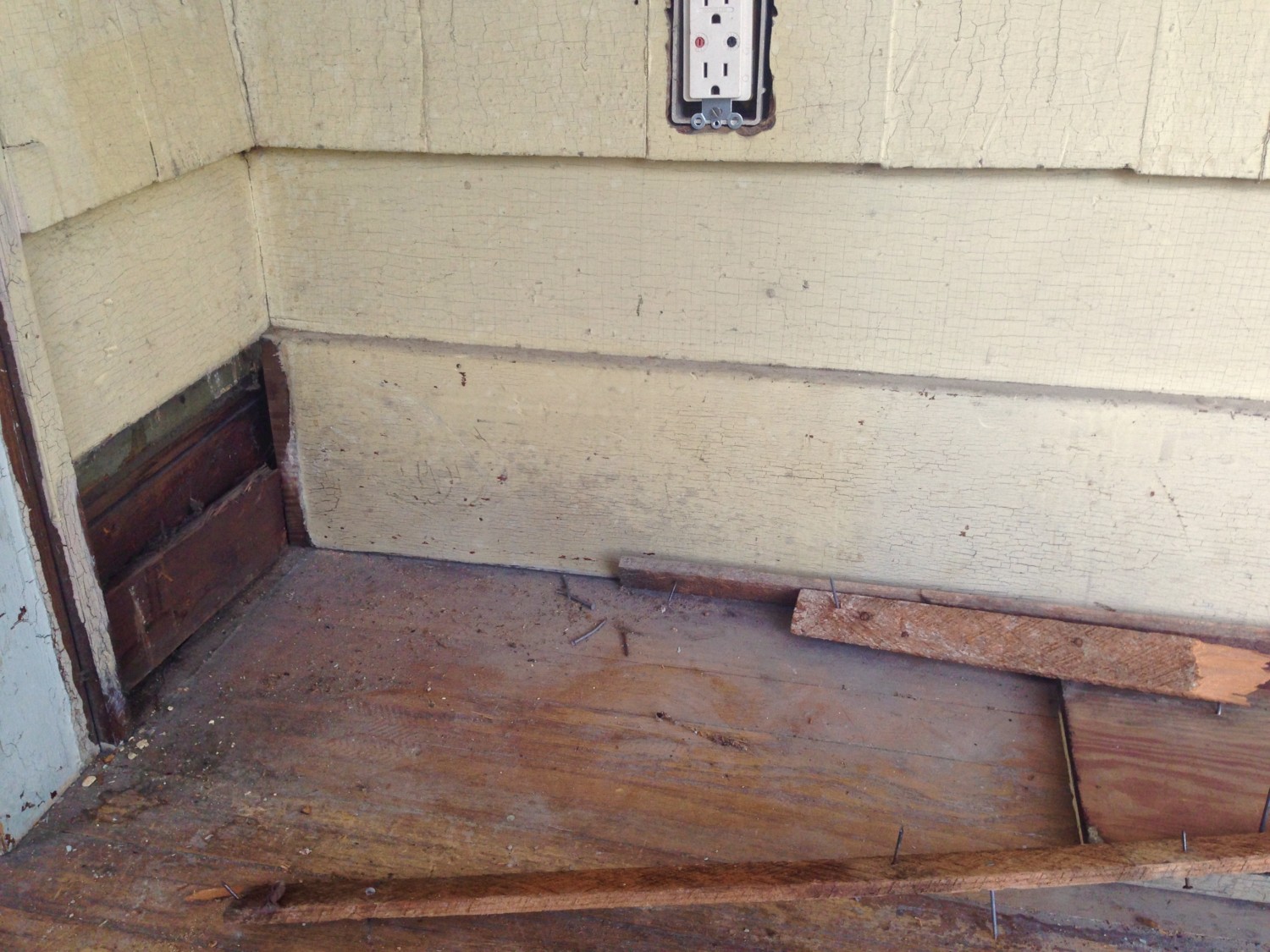 There was also a brutalized section of original interior trim used as filler behind the base moulding. I strongly suspect that this came from the bottom of the original window facing the porch, which was later converted to a door to the porch. Hence, the bottom trim would have become superfluous.