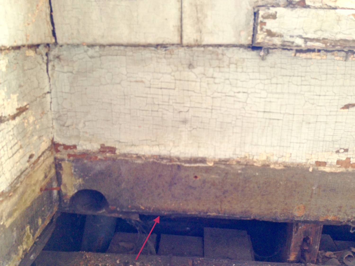 When we pulled off the last section of non-original base, we revealed the TOP of the drain. WE FOUND IT!!!!!!!! We had assumed that the drain has been a straight shot, but now realized that the drain zig-zagged from top to bottom.