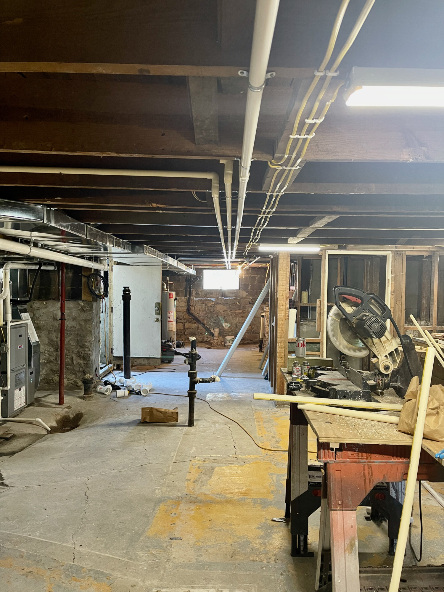 I cannot though cram the basement with delicate vintage lights and crystal chandeliers while still pulling wiring and installing plumbing lines. Justin would refuse to work under such conditions and, even if he did, lights would inevitably get damaged.