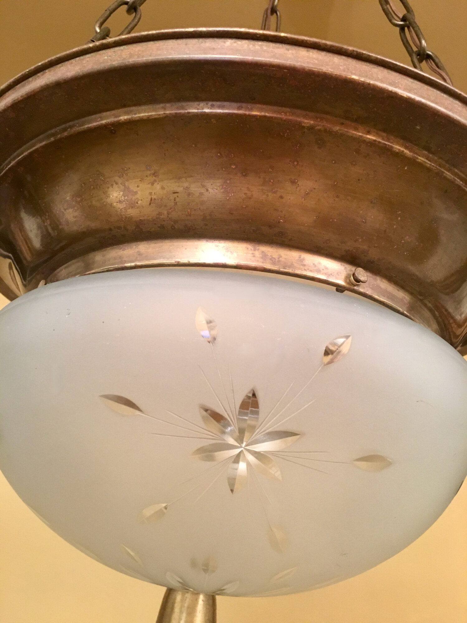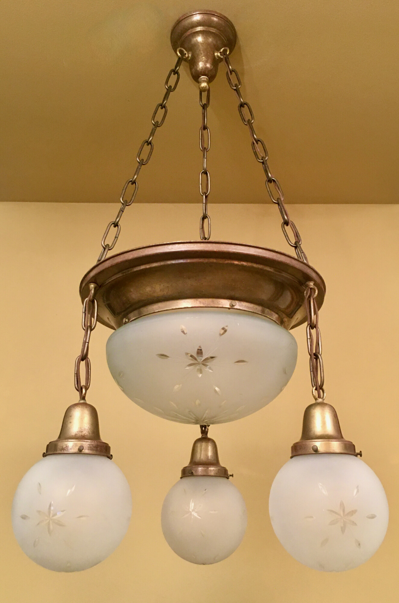 I have something similar to this only the outer chains had nothing to hang a shade from. I read that bare bulbs were often hung this way just to show off that you had electric lighting. I ended up switching out the center shade for for one a bit larger, than I added some collars to the chains to hold some shades and bought three that reasonably match the center. I have a large dining room so I needed a large vintage light. I’m happy with it. But I do love that wheel cut glass. If I didn’t already have a light I would buy that for my dining room.