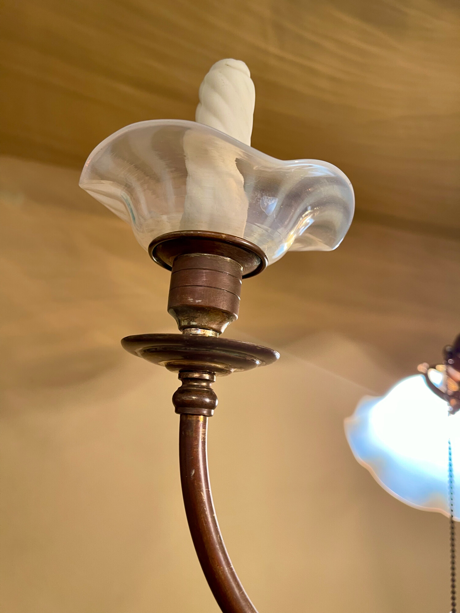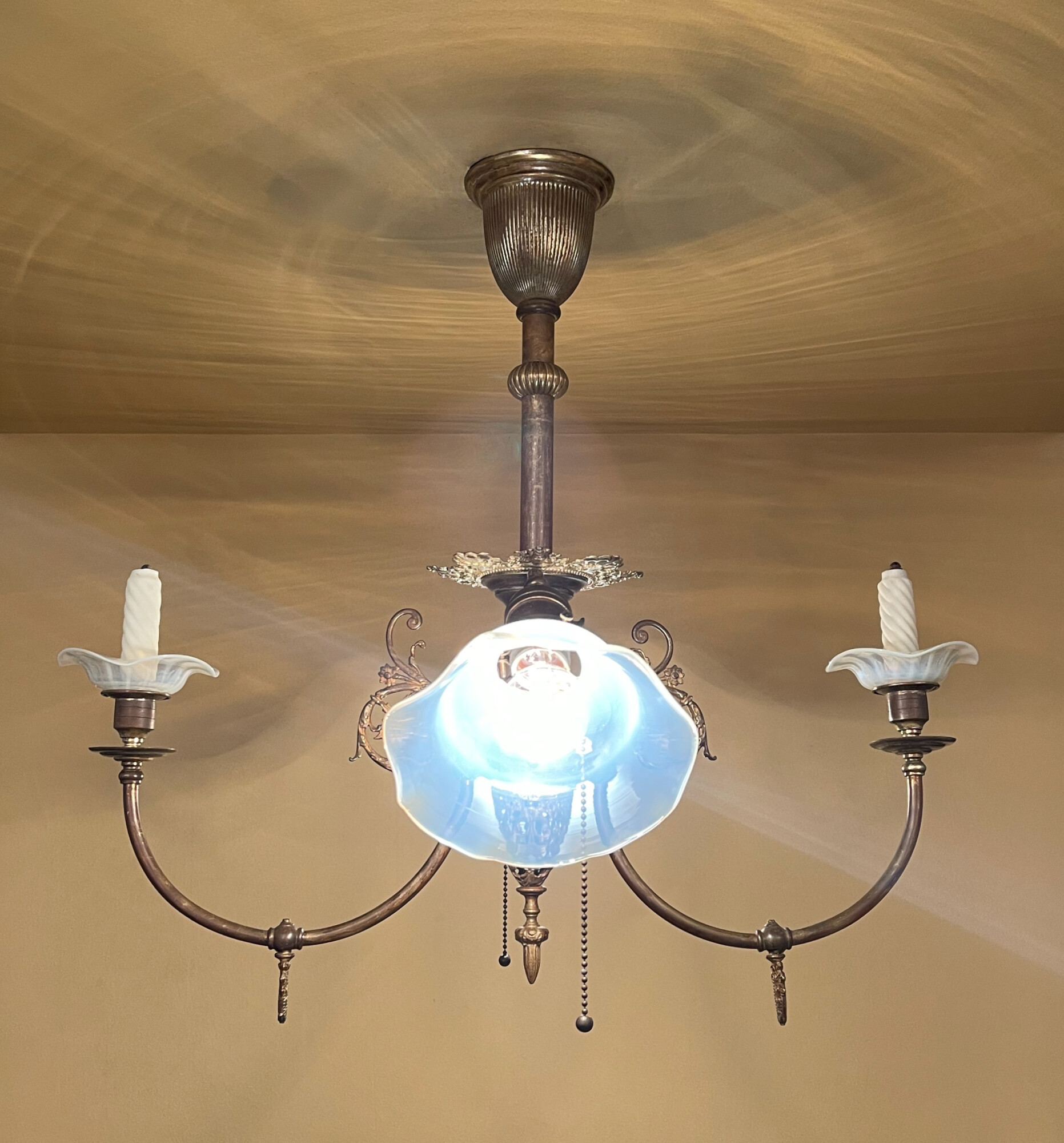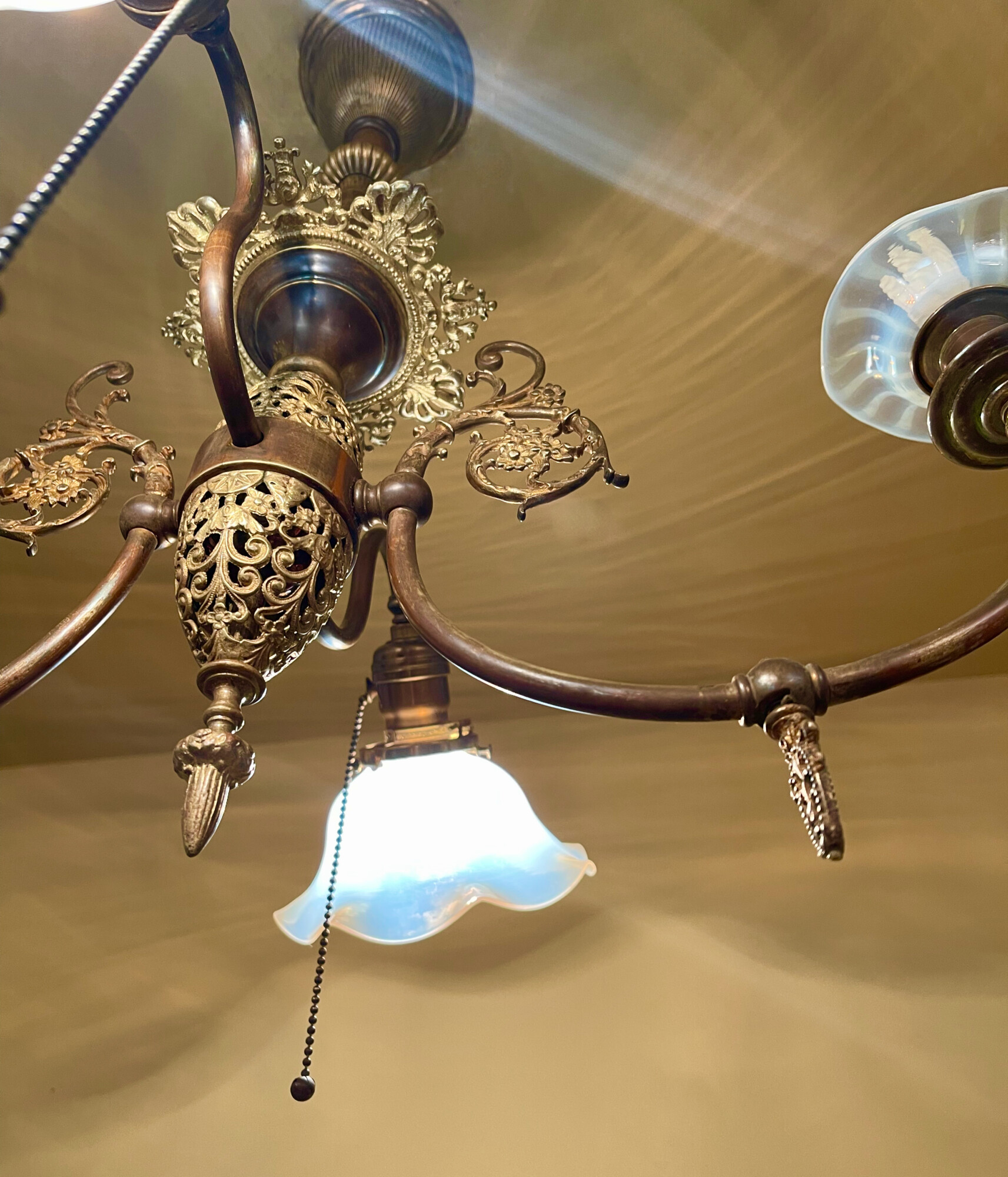 The electric arms feature a pair of dazzling opalescent glass shades. The gas arms feature a pair of opalescent bobeches!