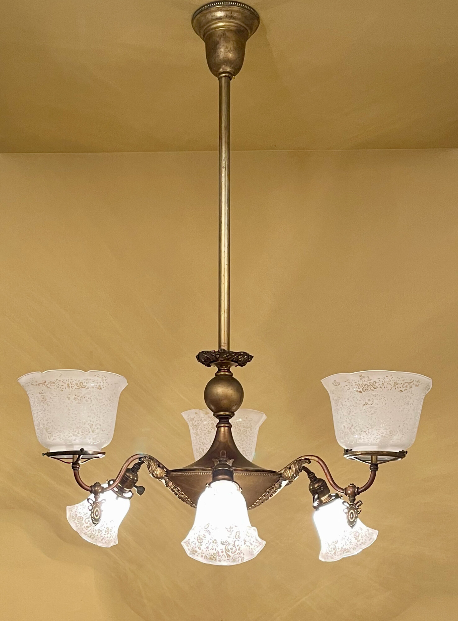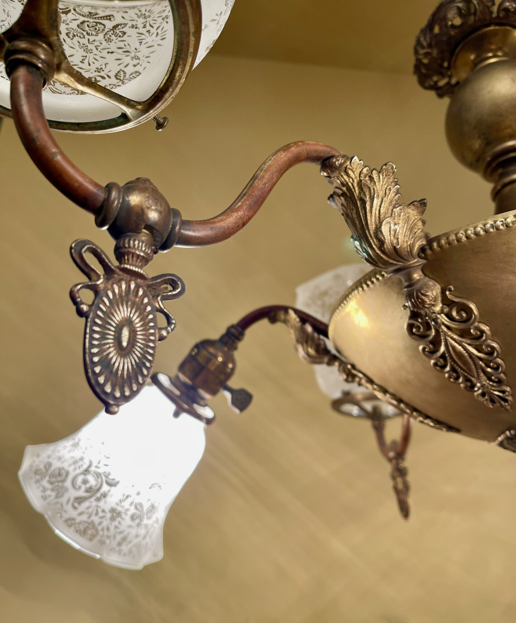 I love the cast brass anthemion motif (right) and adjacent acanthus leaf, also in cast brass. And the gas turn keys are nothing to sneeze at! Well, after languishing for years in storage, I finally got this 31-inch-wide whopper listed for sale.