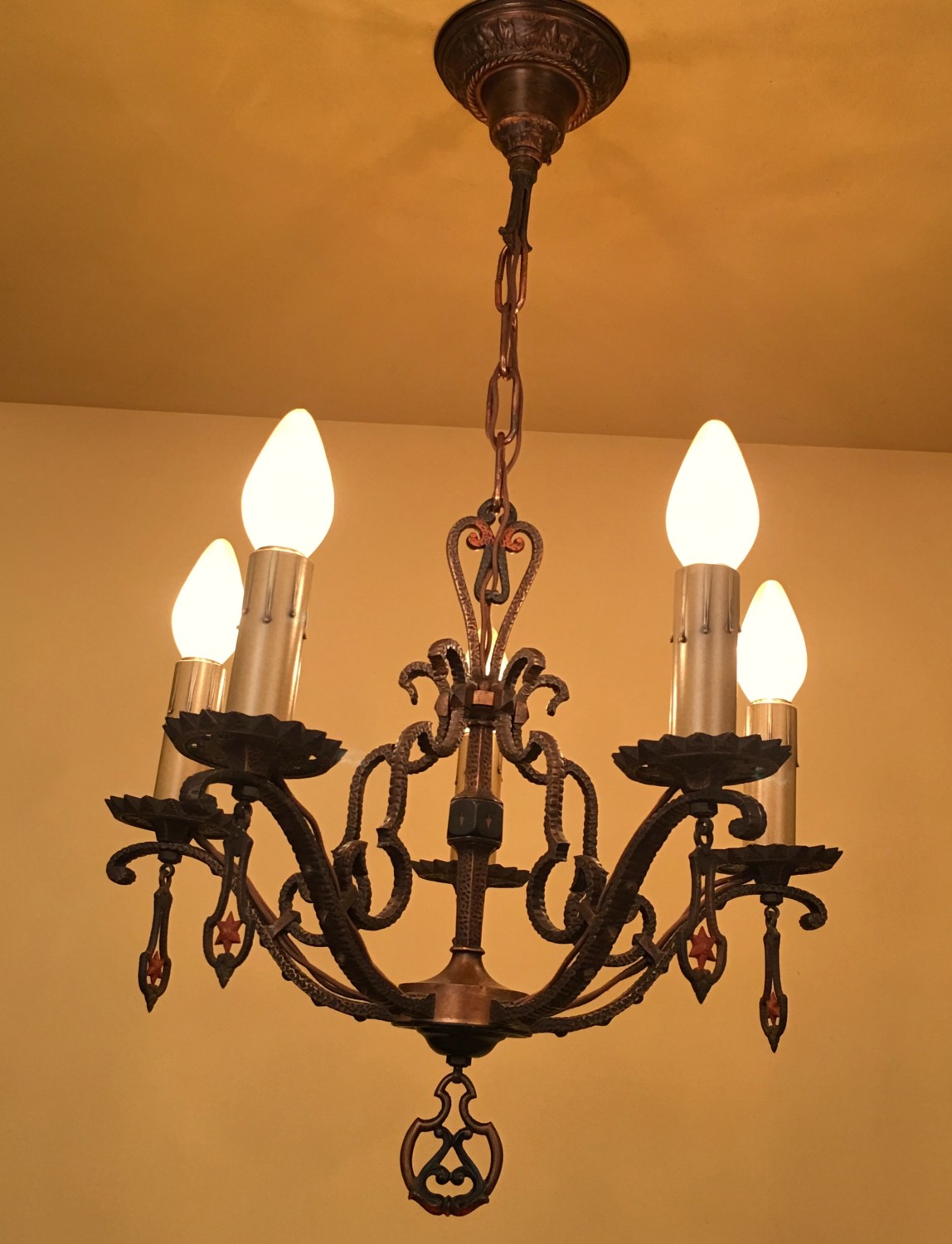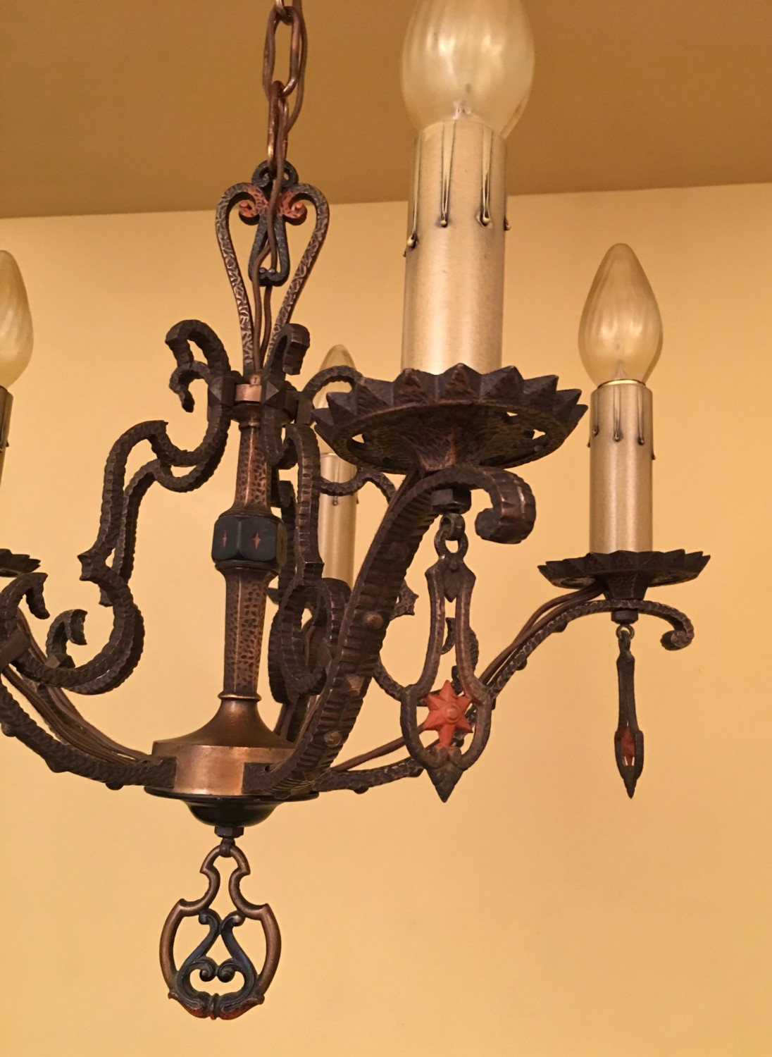 Like this set by Mid-West Chandelier Company of Kansas City, circa-1930. They are made mostly of cast brass. This retains its original polychrome finish which looks like a very old penny. Almost black but with a coppery hue. Stunning.