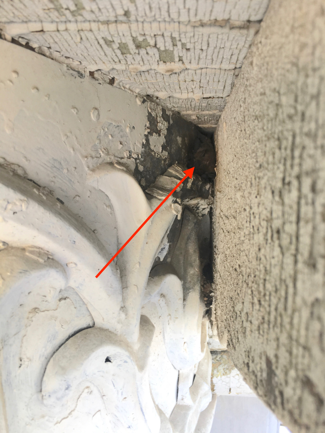 I am now up close with the wood brackets. Whoee! Behind the brackets is a curved stamped tin decorative panel. I held onto the scaffolding and tucked my head behind the brackets…