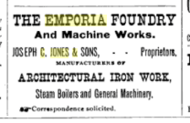JOSEPH C. JONES, foundry, was born in Monmouthshire, Wales, February 28, 1831. Came to the United States in 1851, and after a residence of about three years and a half in New York City, resided for thirteen years in Pennsylvania. In 1871 started West, and after three years spent in Ohio came to Kansas in 1874. Located in Emporia. Having early in life learned the trade of foundryman, which he has since followed, he bought the only foundry in the city, located on the M. K. & T. R’y track near the depot. After he had operated it about a year and a half it was destroyed by fire. He then, in 1876, erected a new foundry building on the corner of Market street and Third Avenue, which he continues to operate, doing mostly a jobbing business. Married Miss Catharine Fisher of New York City, March 16, 1852, and by this marriage has had seven children, of whom Horace G., George F., Charles W., and Joseph E. are living.