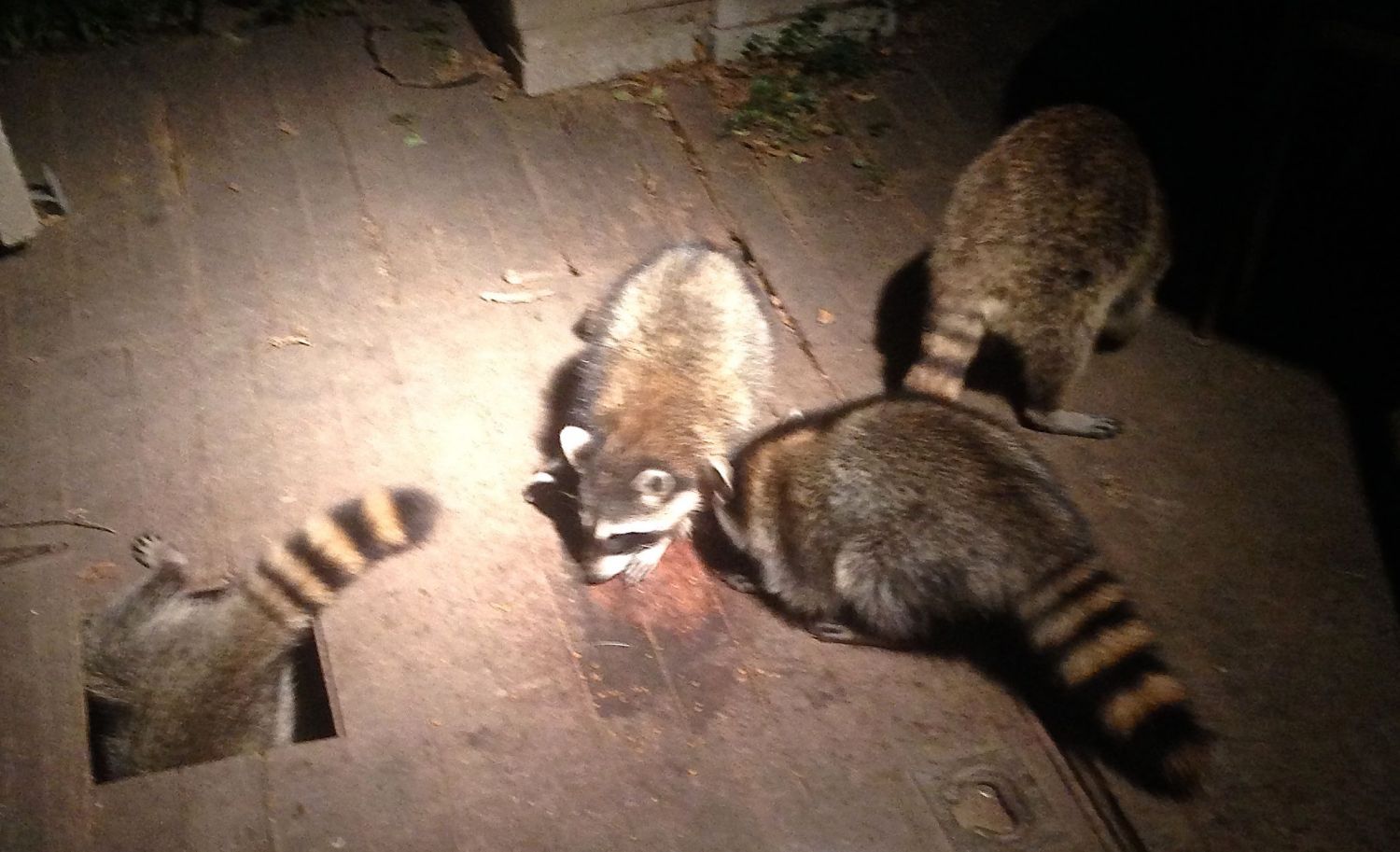 The other night, just before going to bed, I turned on the deck light, and glanced outdoors. Oh dear. Oh my! There were five raccoons devouring the last bits of cat food. I grabbed my camera, but one raccoon vanished, and another scurried into a hole below the deck. I recall this raccoon set from a year previous, when Mom Raccoon and her four small babies ventured onto the same deck. My, how her babies have grown!