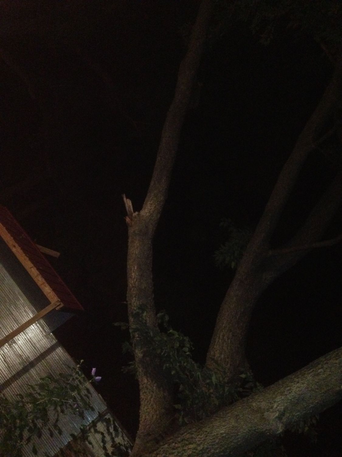 The same image enhanced. Can you see one of the intruders? Well, all five scurried UP the high branches, then WAY up, then they jumped to the high branches of a neighboring tree (which I would not have thought possible but for seeing this with my own eyes), then down and out past the fenced yard. Geez. Such acrobats!