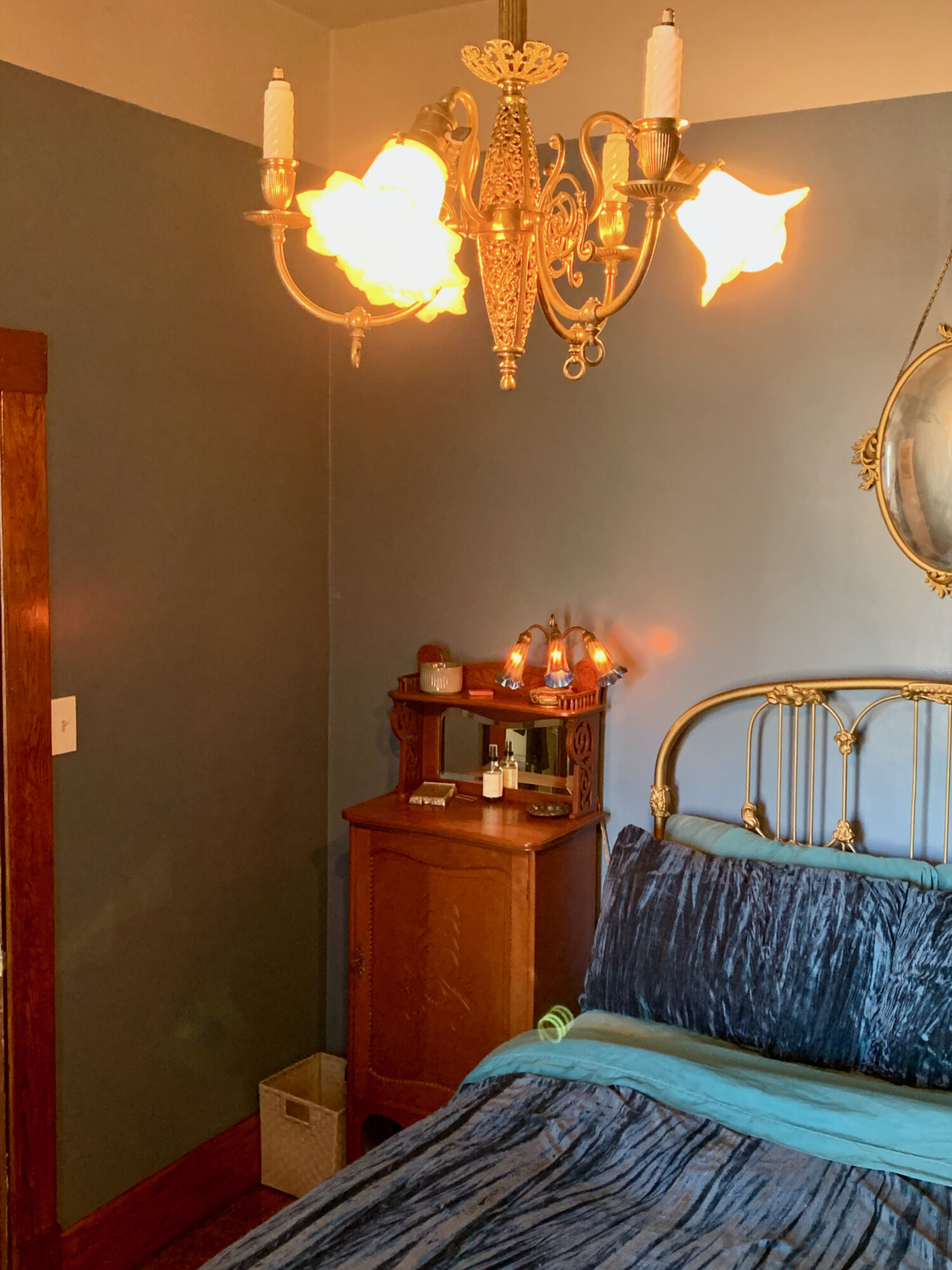 It’s gorgeous, I love Cody’s taste in antiques! I can’t tell exactly what the wall color is but it seems to go beautifully with the shiny brass and warm wood tones.