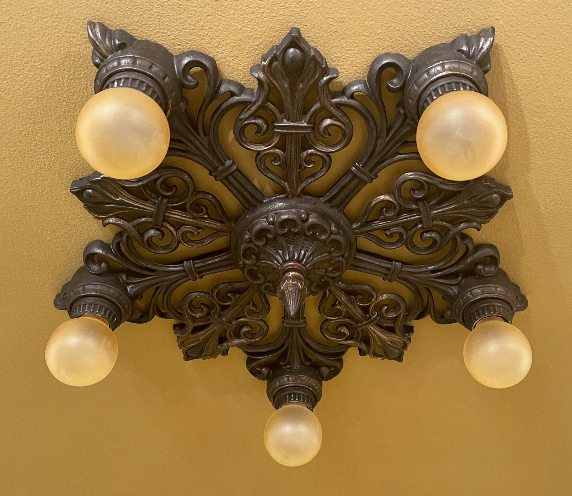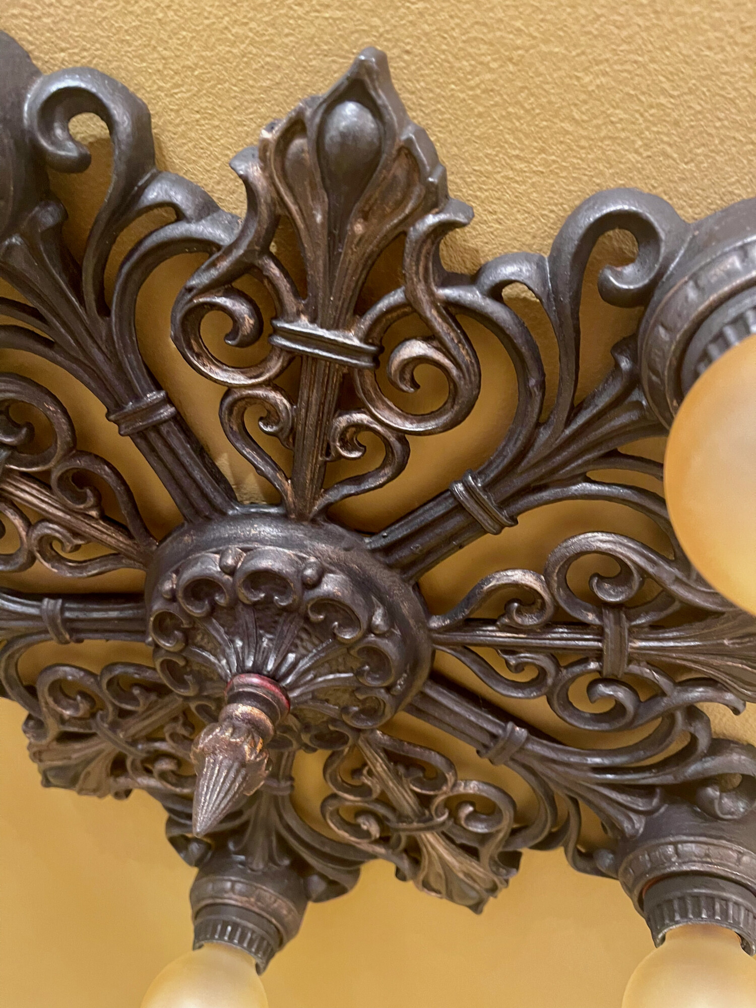 A sad-looking 1920s Spanish-Revival ceiling fixture, badly overpainted in black and gold. Oh, the horror. So…of course…Ross had to save it. Scroll way down…
