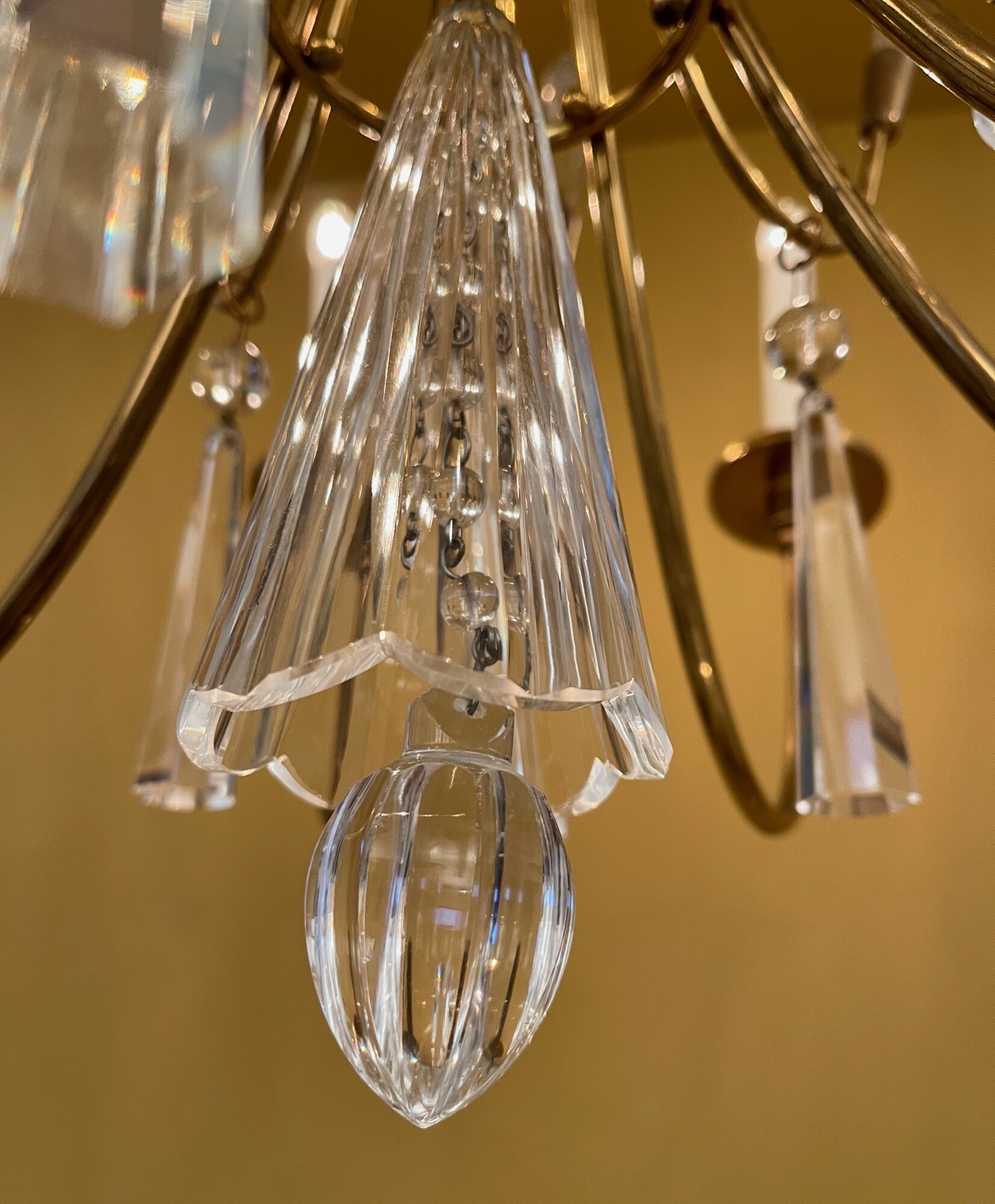 The chandelier proved to have a gobsmacking finial. It’s a long crystal bell (6-inches!), with a crystal ‘clapper’ hanging from inside. That these delicate components remain is astonishing.