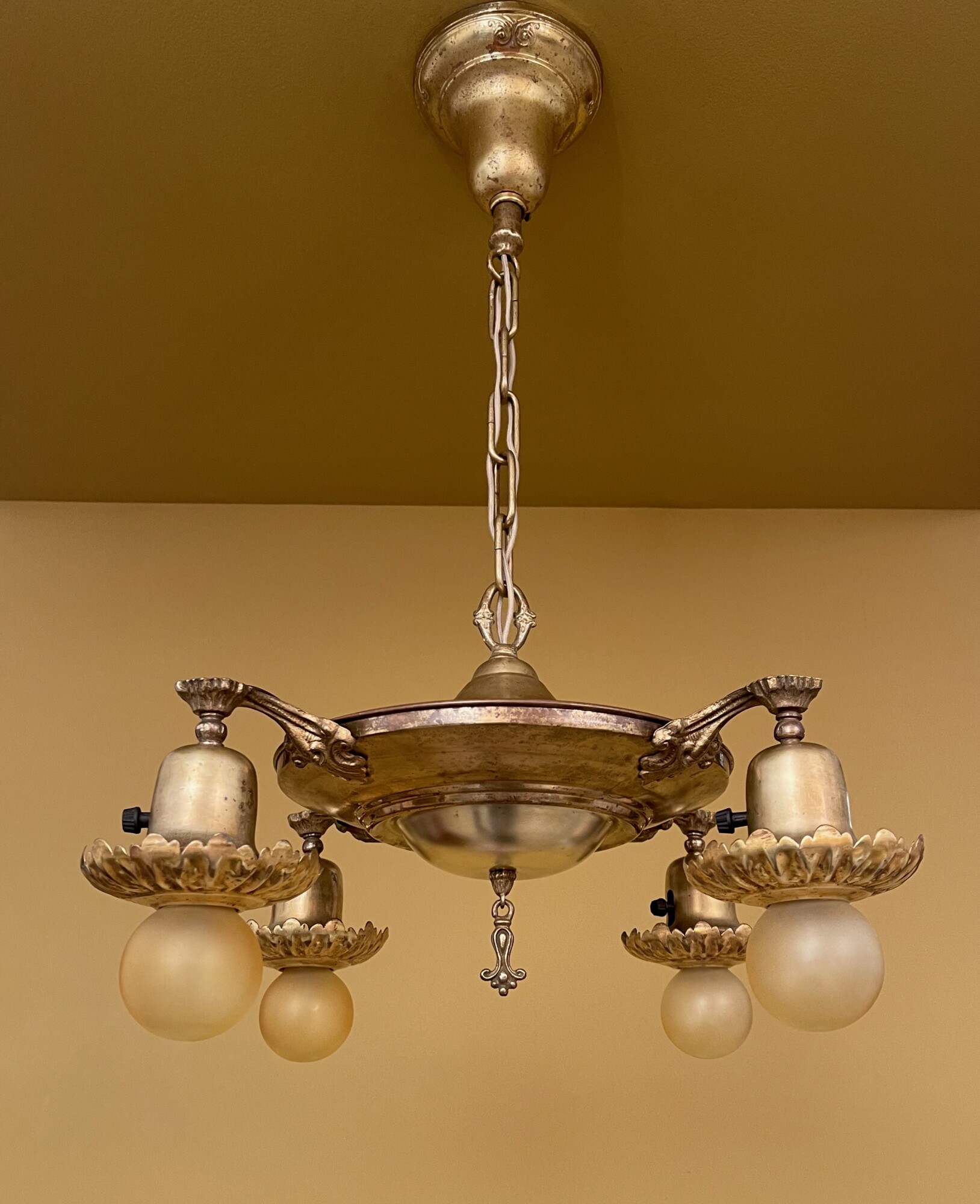Most of the fixture is brass. This had been very badly overpainted over the years. I removed all the paint, revealing the underlying bass which had a kinda sorta tortoiseshell patina which I really liked. I retained this, but the bottom dome was too splotchy so I polished this bright. I love the contrast. I think of this as an ‘artful’ restoration.