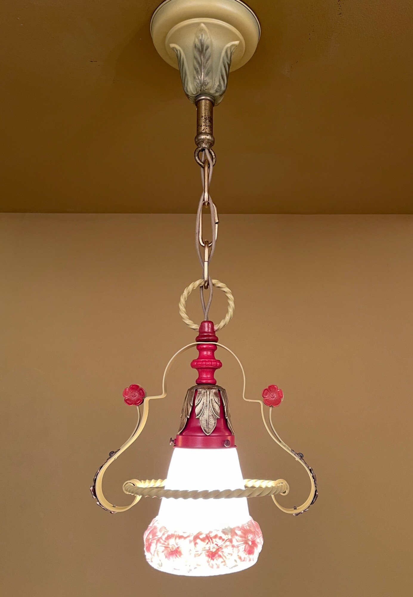 Kenny  found this pitiful thing. I felt I had no  choice but to save it. The shade is not original. Also, it had been spray-painted black. Oh, the horror. But…drum roll, please…you can see hints of red peeking out. Oh!  Later, I discovered that the main color was a kinda buttery finish. Golly! It was a lot of fun (and work) to carefully restore the original finish. Scroll down to gasp!