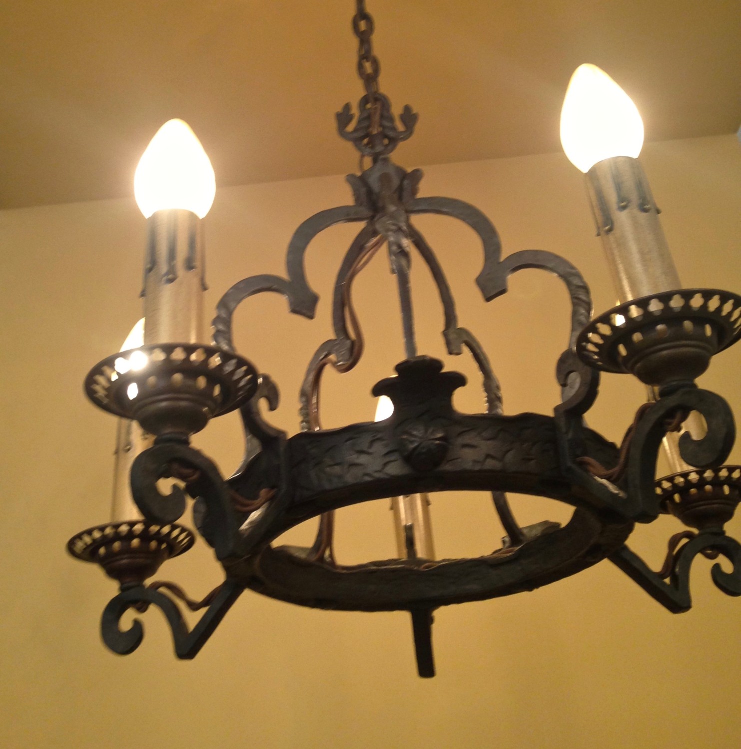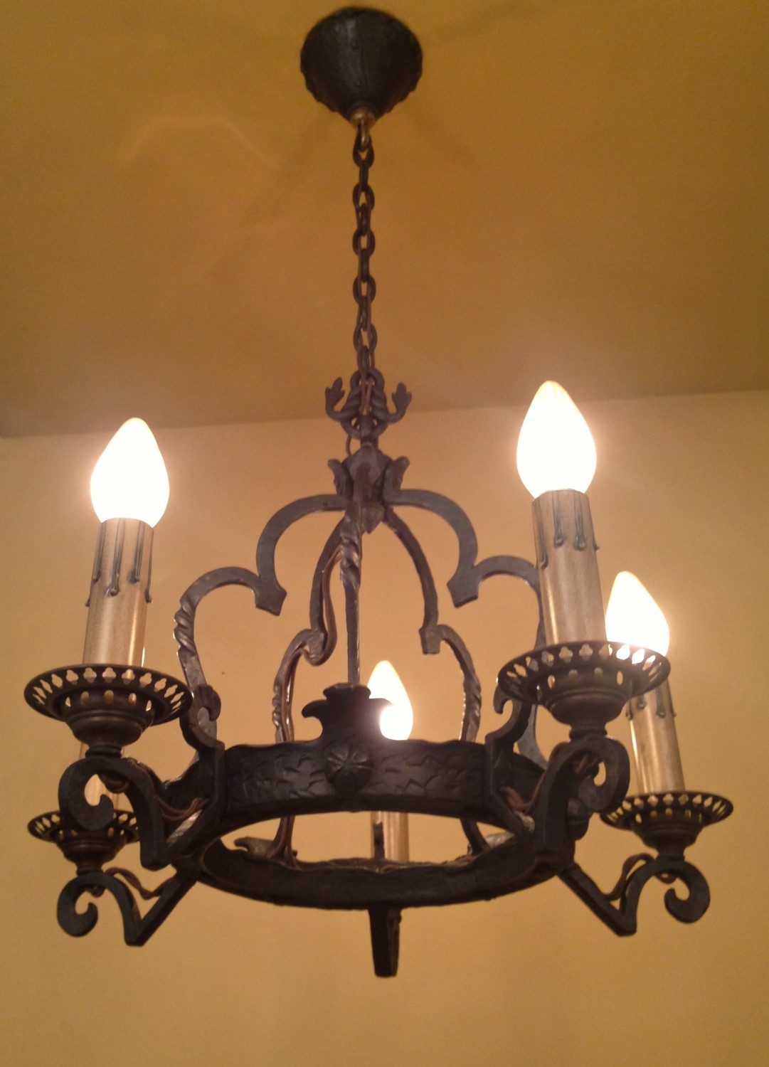 I love Lightolier. They made gorgeous, impressively high-quality fixtures. You can thus imagine my great excitement when I found a matching 1920s Spanish-Revival set online! However, I hesitated, for I knew the set originally had glass shades. And the missing shades will NEVER be found (I state that based on experience). There was one chandelier…
