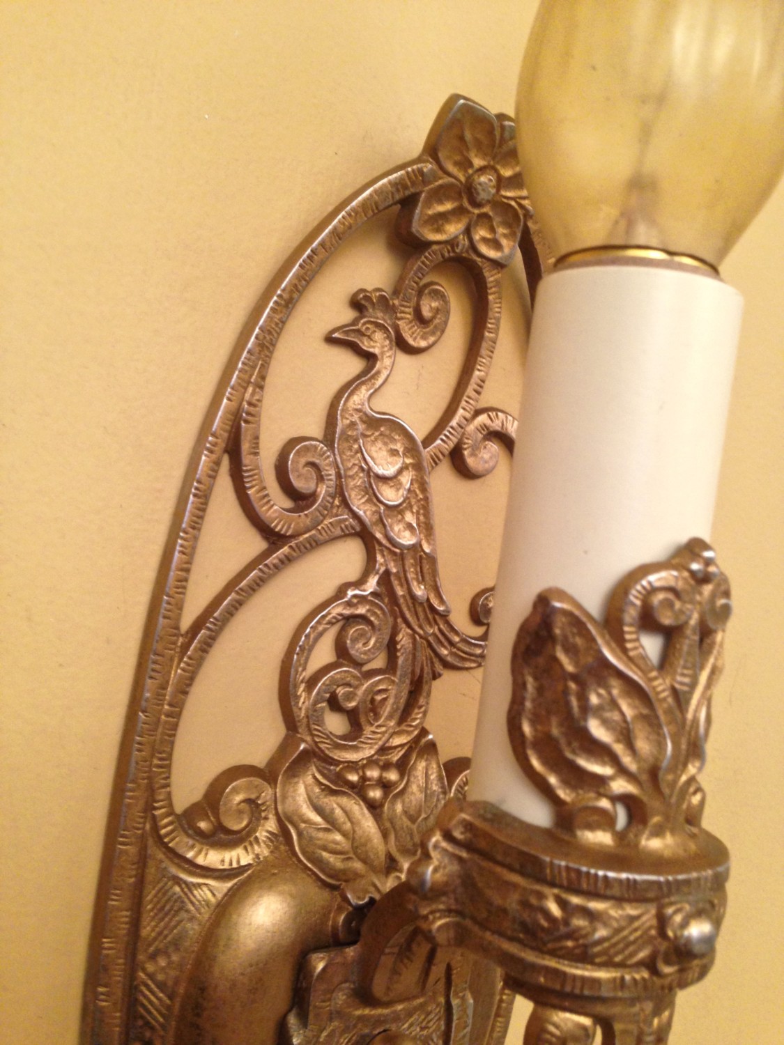 They could be this! I did a controlled stripping of the non-original finishes, which revealed gold over the cast aluminum bases. I was able to keep much of the original gold finish, which now allows the underlying aluminum to peek through. Lovely.