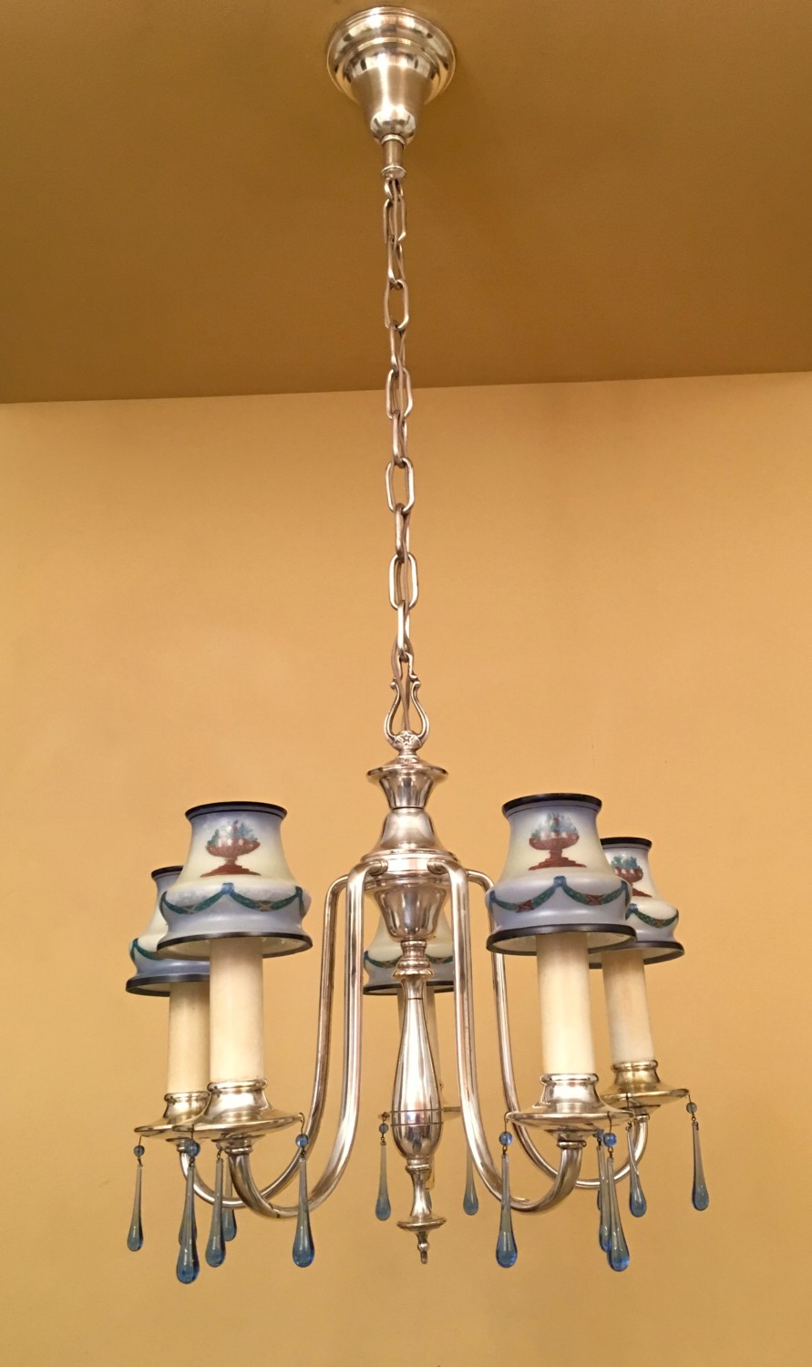 I debated buying this 1920s Colonial-Revival-style silver-plated chandelier. It was $$$. But it had original blue glass drops! And, astoundingly, what appeared to be original, and extraordinarily rare, glass shades! Well, what choice did I really have? I purchased it. I thought it would need a simple polish and rewiring. But….no. Some ding-dong sprayed lacquer OVER tarnished silver-plate! So, I had to laboriously strip the whole thing, and then polish. Argh! But the results?