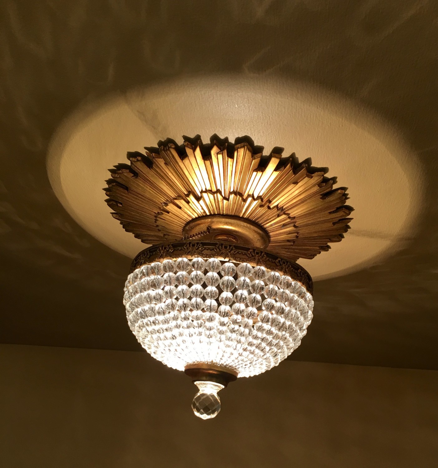 This was online. A circa-1930 crystal starburst. Cool. But how did the shade attach to the fixture? And how did the fixture attach to the ceiling? Were all the parts included? Well, the seeming high quality inspired me to take a chance, and I crossed my fingers that once in hand I could figure out how it all went together.