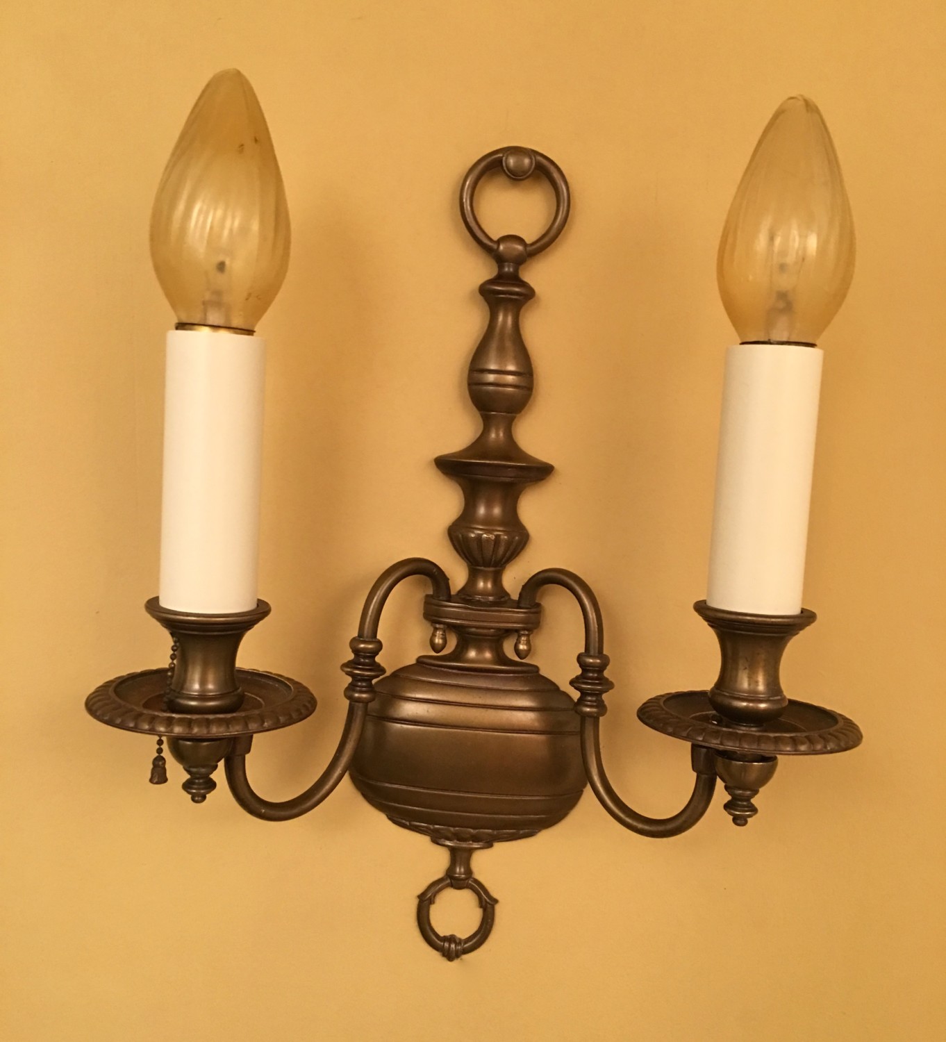 Over the many years of restoring vintage lighting I have learned to get really cautious about buying fixtures with thin tubular arms. Why? Because sometimes I cannot get the old wires out. And fewer things are more deeply vexing. Like with the above sconce, part of a set of four circa-1930 Colonial-Revial sconces. About six years ago I tried, mightily, to get the damn old cloth wires out of the thin tube arms. But…no. No. NO! Cursing the damn sconces, I roughly tossed them in a box and shoved them into the darkest recesses of my vast storage vaults. And there they remained. However, during the ensuing years I have learned a trick or two and recently thought: Could I now rewire that damn set of sconces?