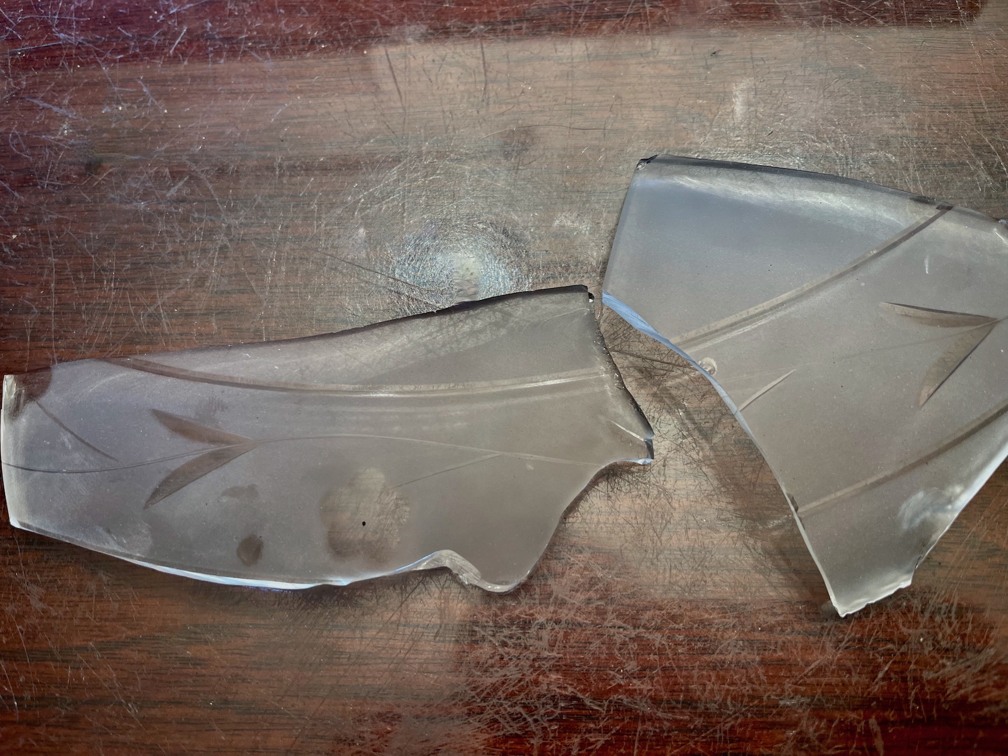 The seller packed stupid and the 16-inch-wide glass shade arrived shattered to bits. I was only able to recover two pieces which I hoped would inform finding a matching shade:
