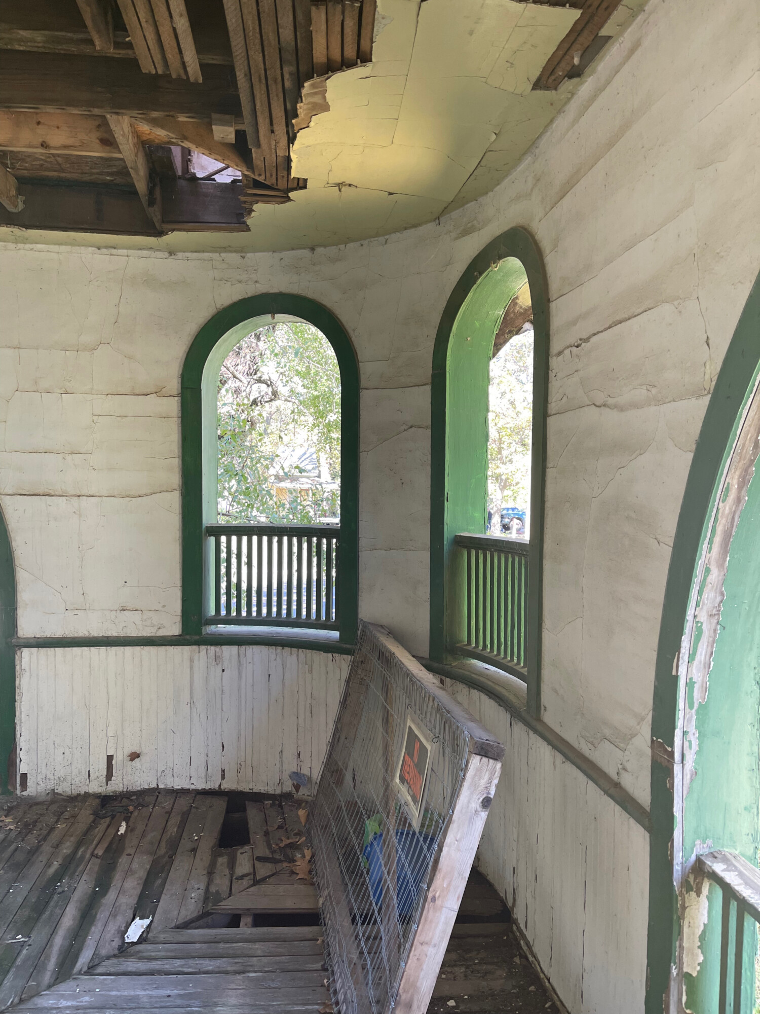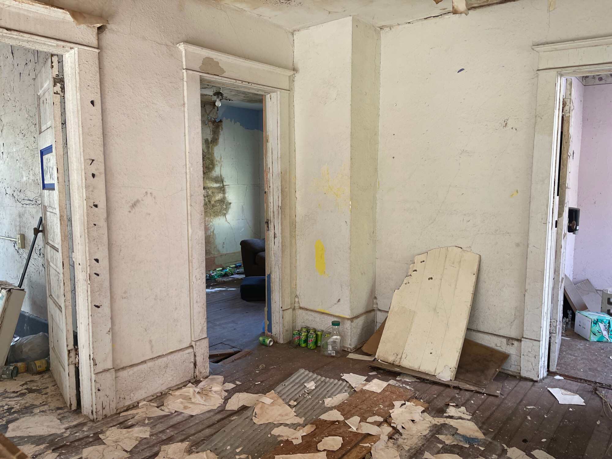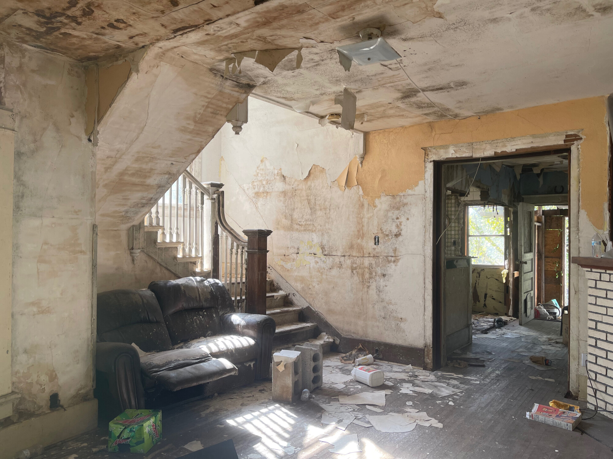 I had not expected to be able to walk through the house, assuming decaying floors and rotted floor joists. I found little of this. All to my great surprise considering the fact that there is, in effect, no roof. What seems to happening is that the plaster ceiling is…currently…acting as a roof, and absorbing much of the water (hence all the mold). This situation will not last much longer. And when the ceiling fails the house will soon be doomed.