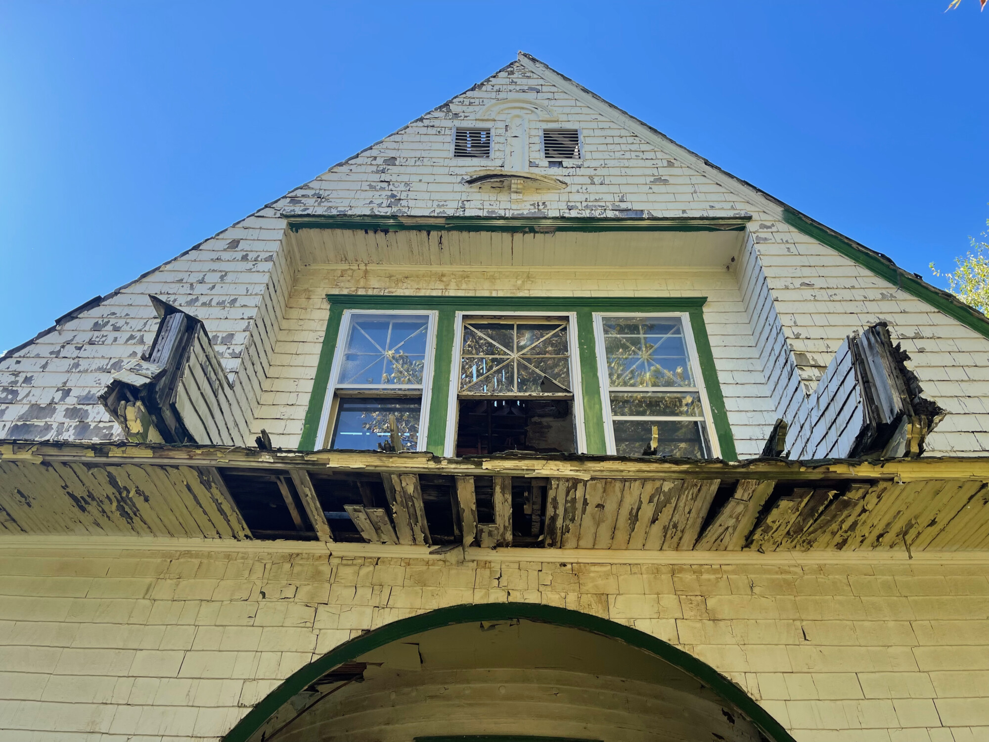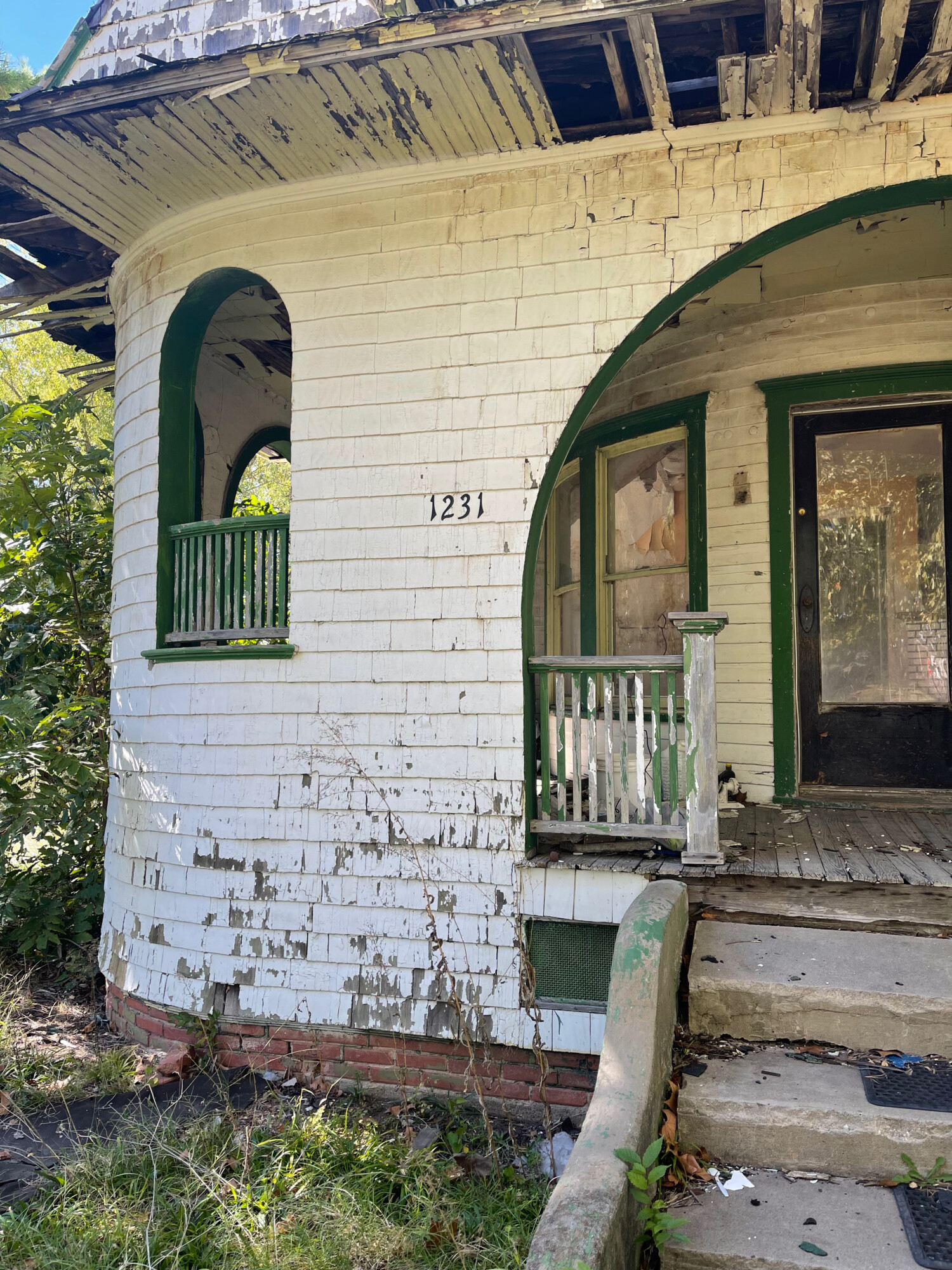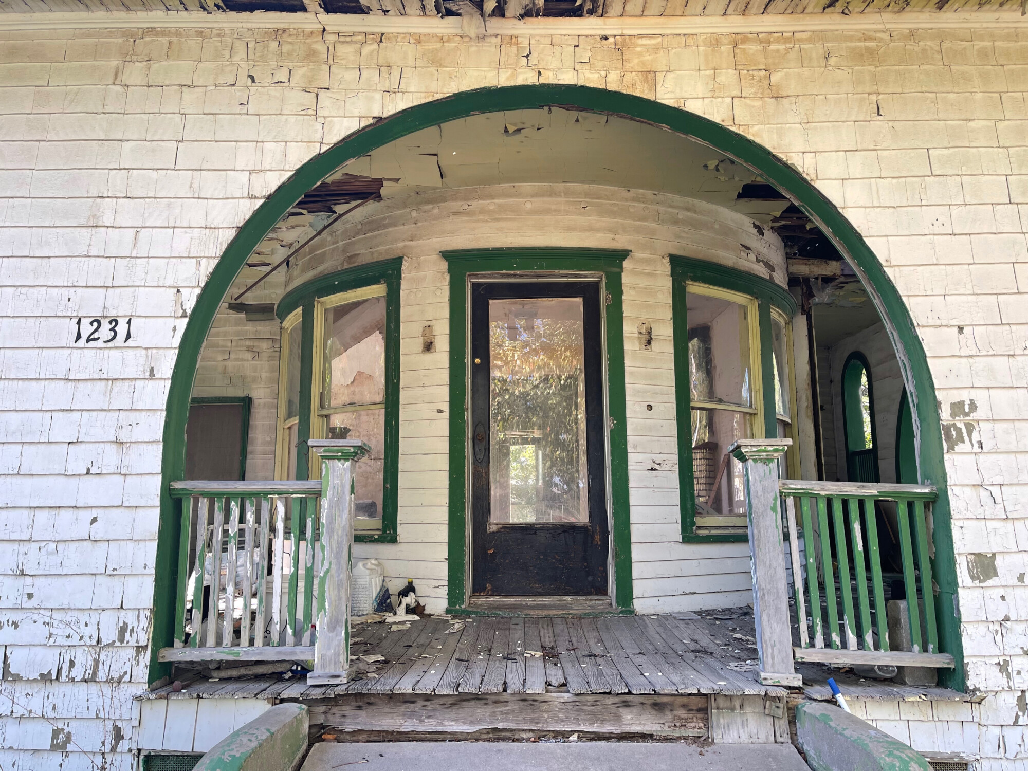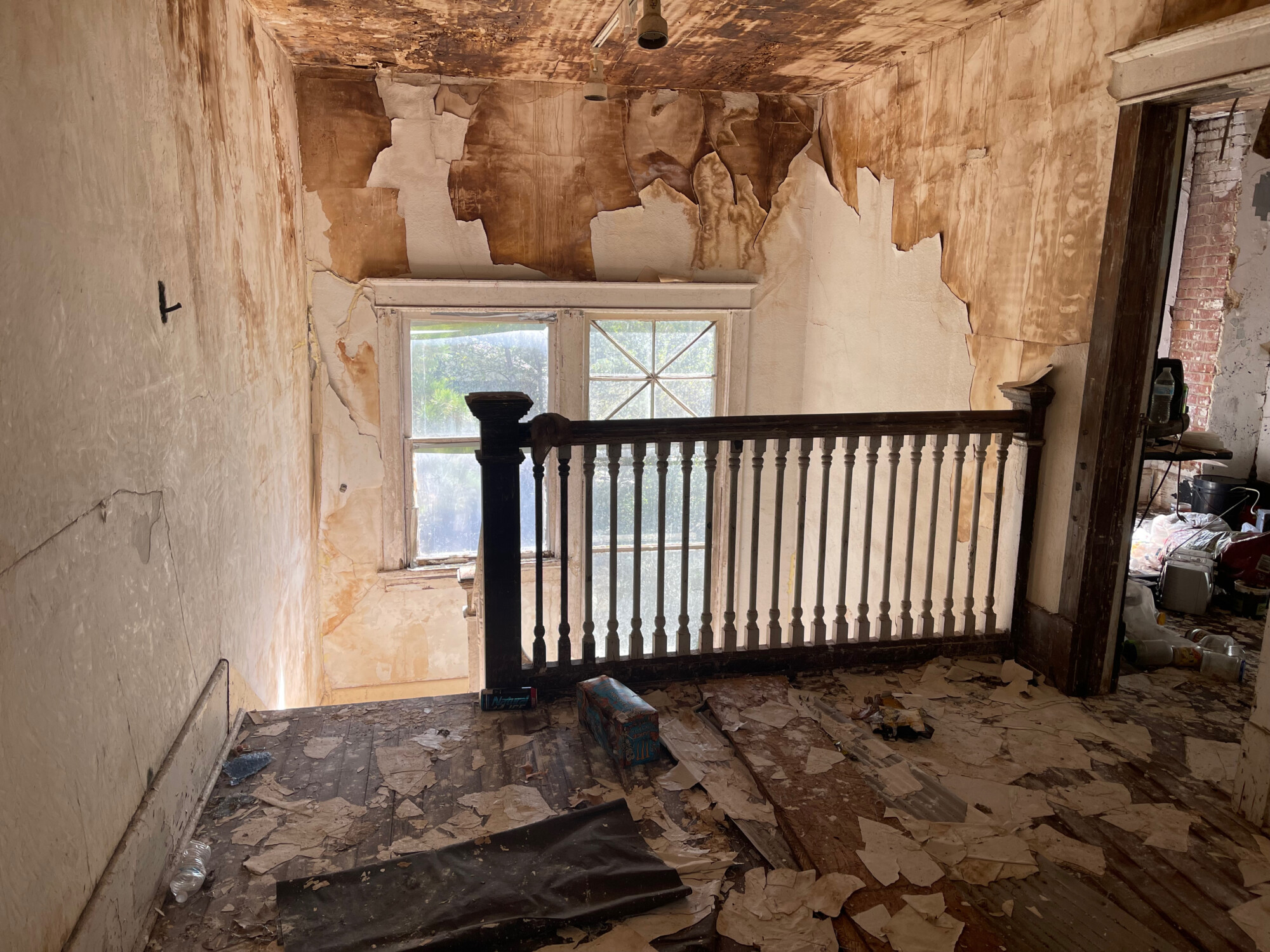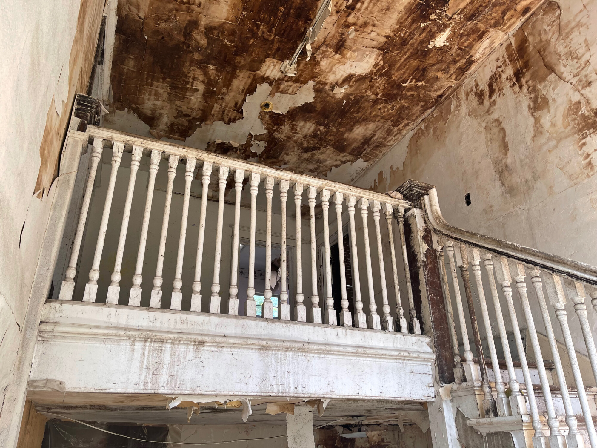 My first thought was that the attic had been fire damaged but it became obvious that this was not the case. Rather, it appeared that at some point not too long ago somebody decided to reroof the house and gave up, leaving the structure exposed to the rain. Note though the unique first-floor porch. I have seen this before…
