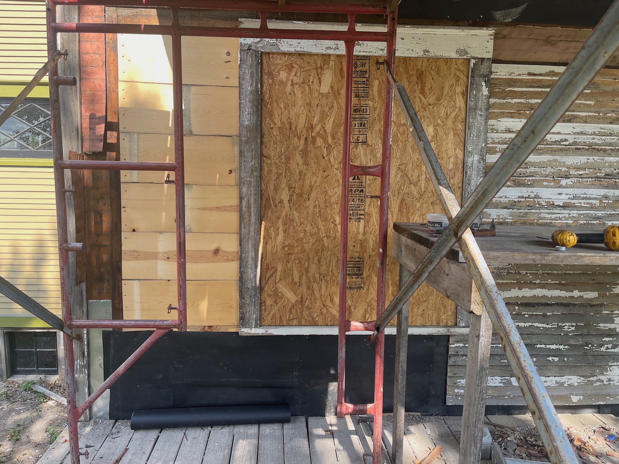 I have not touched the Carriage House since last week, due to the extreme weather. Today was hot (92) but not humid. A large fan saved the day. Today I fully screwed the sheathing which had just been tacked in place. I added flashing left and right, low. I nailed down the lap-siding lower right. And added tarpaper. Baby steps, baby. Baby steps. Tomorrow I will install siding under the window.