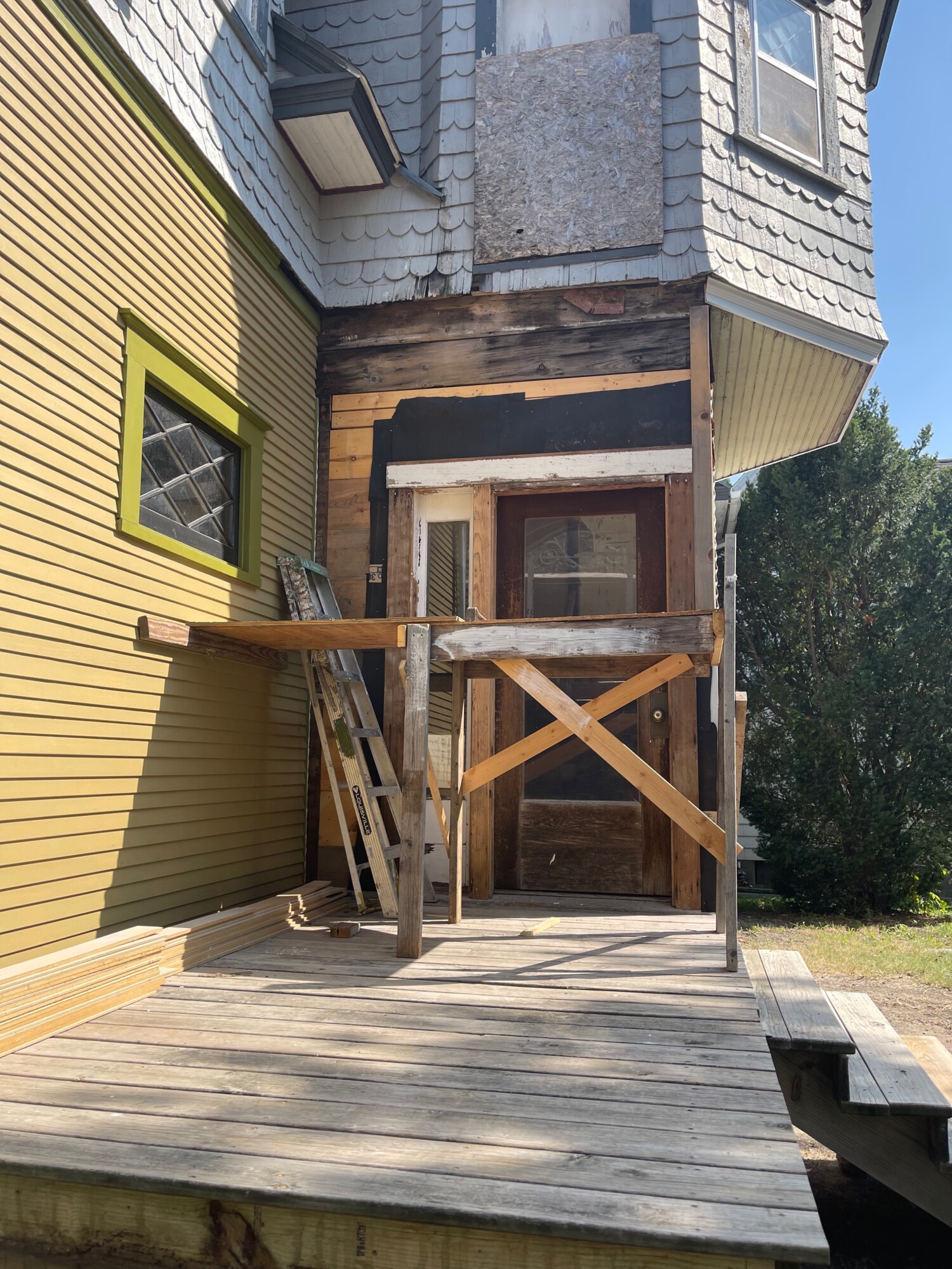 Hi, Brian! That’s a boarded-over door. It used to offer entry to the roof of the circa-1921 porch which I removed in 2014. I will later remove the door.