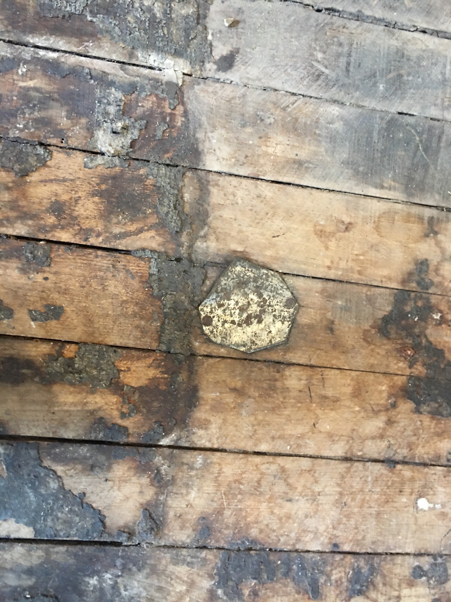 See the original maple floor adjacent to the hearth? See the black glue? Note how it stops in an even line parallel to the hearth, and short of it?