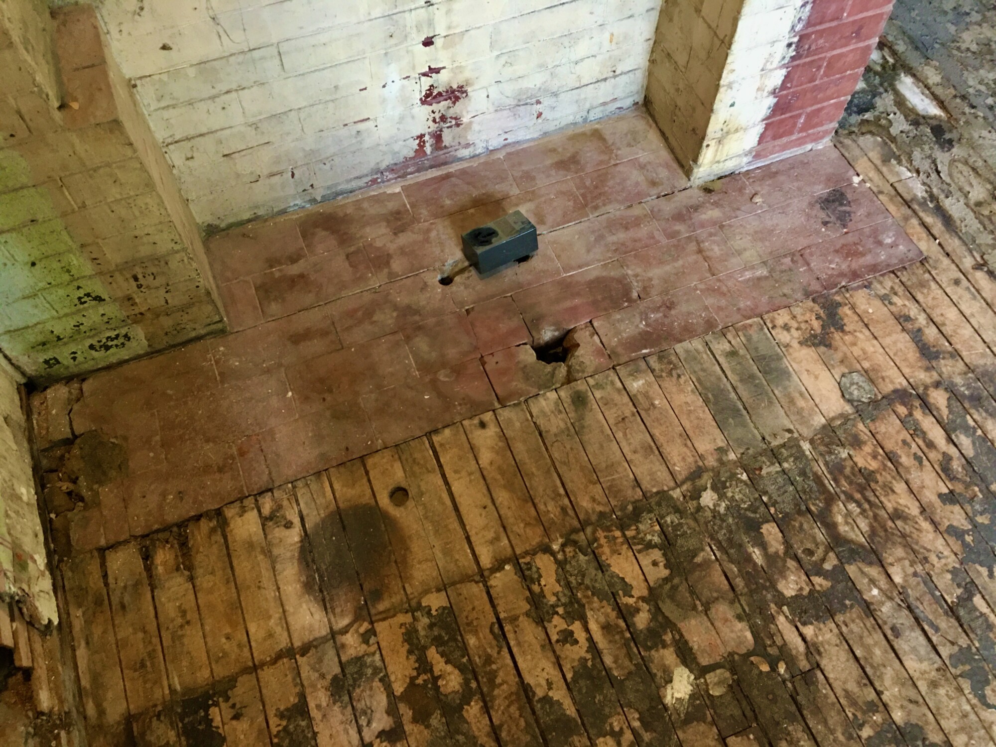 Hi, Colin! The lack of black glue on the original floor strongly suggests that a built-in cabinet was installed against the brick chimney, and the holes in the brick hearth strongly suggest that the cabinet included a sink. This work was, methinks, part of the late 1920s work on the house, which was extensive.