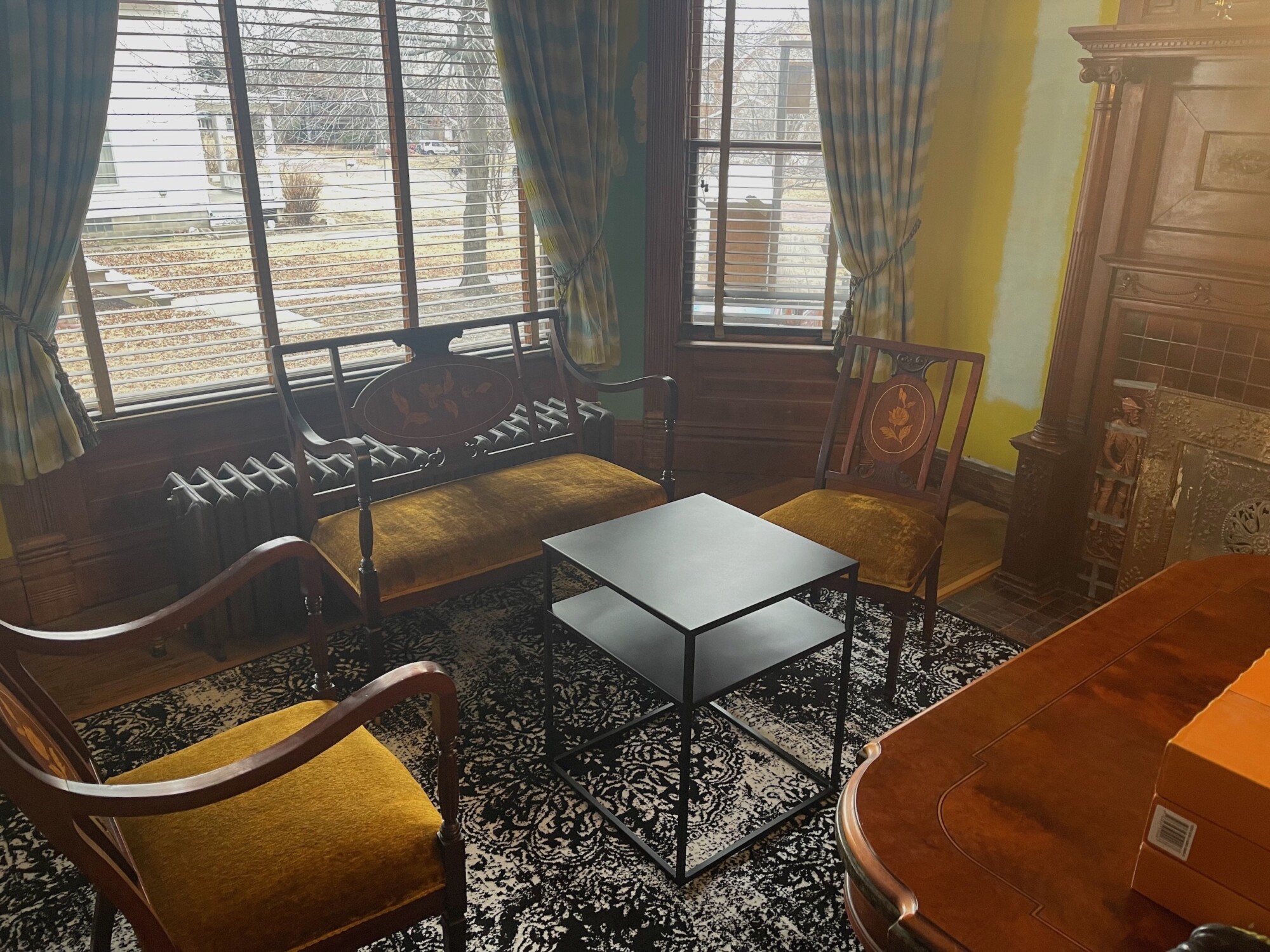 I love the darker wallpaper inset idea, it references the parlor without exactly matching… and i think a more serious/moody tone is right for a library! The 1920’s set does look good, but so will the “hipster” chairs.