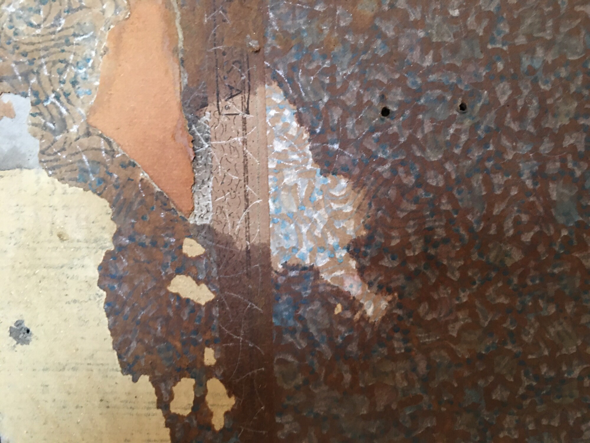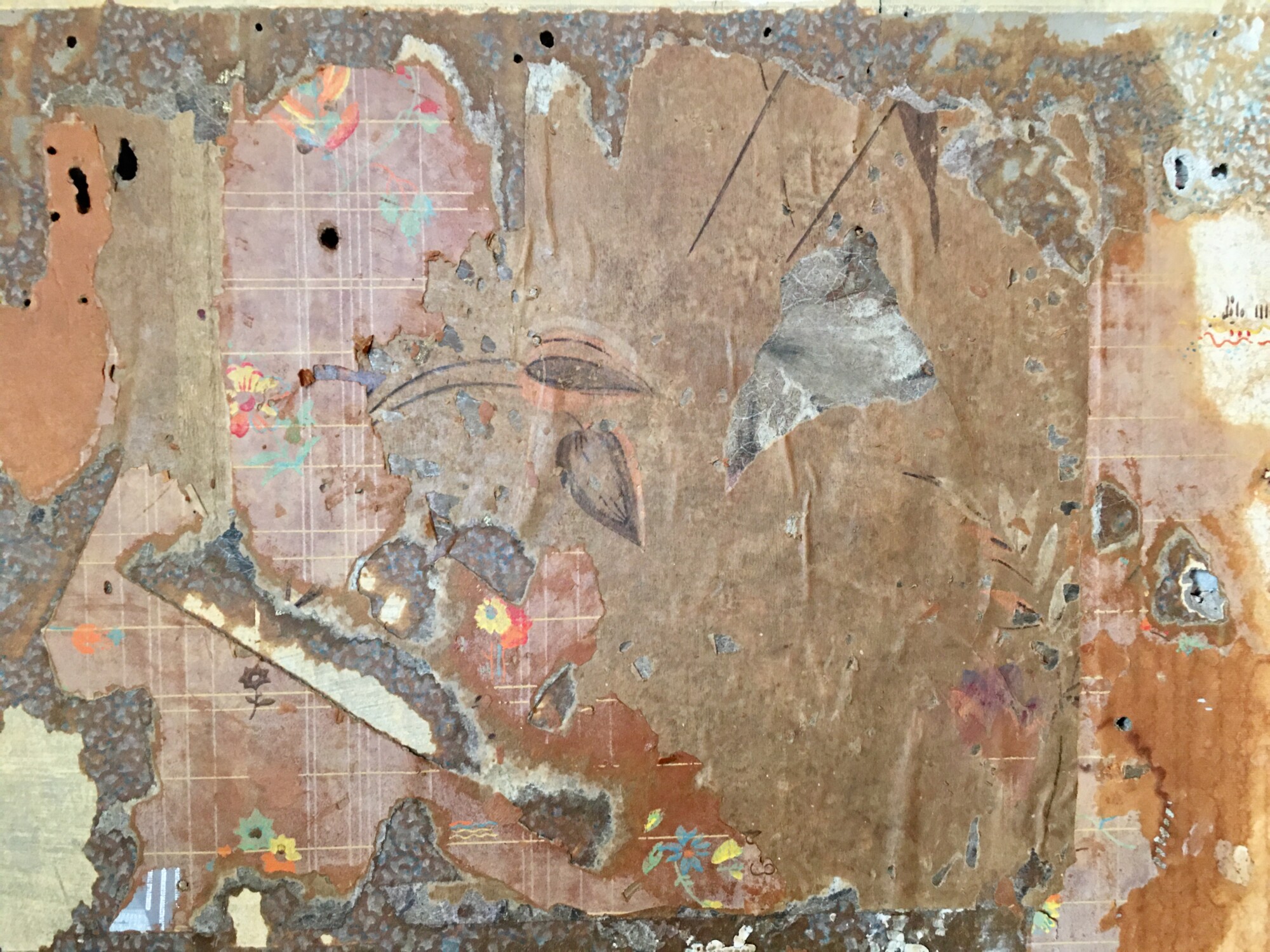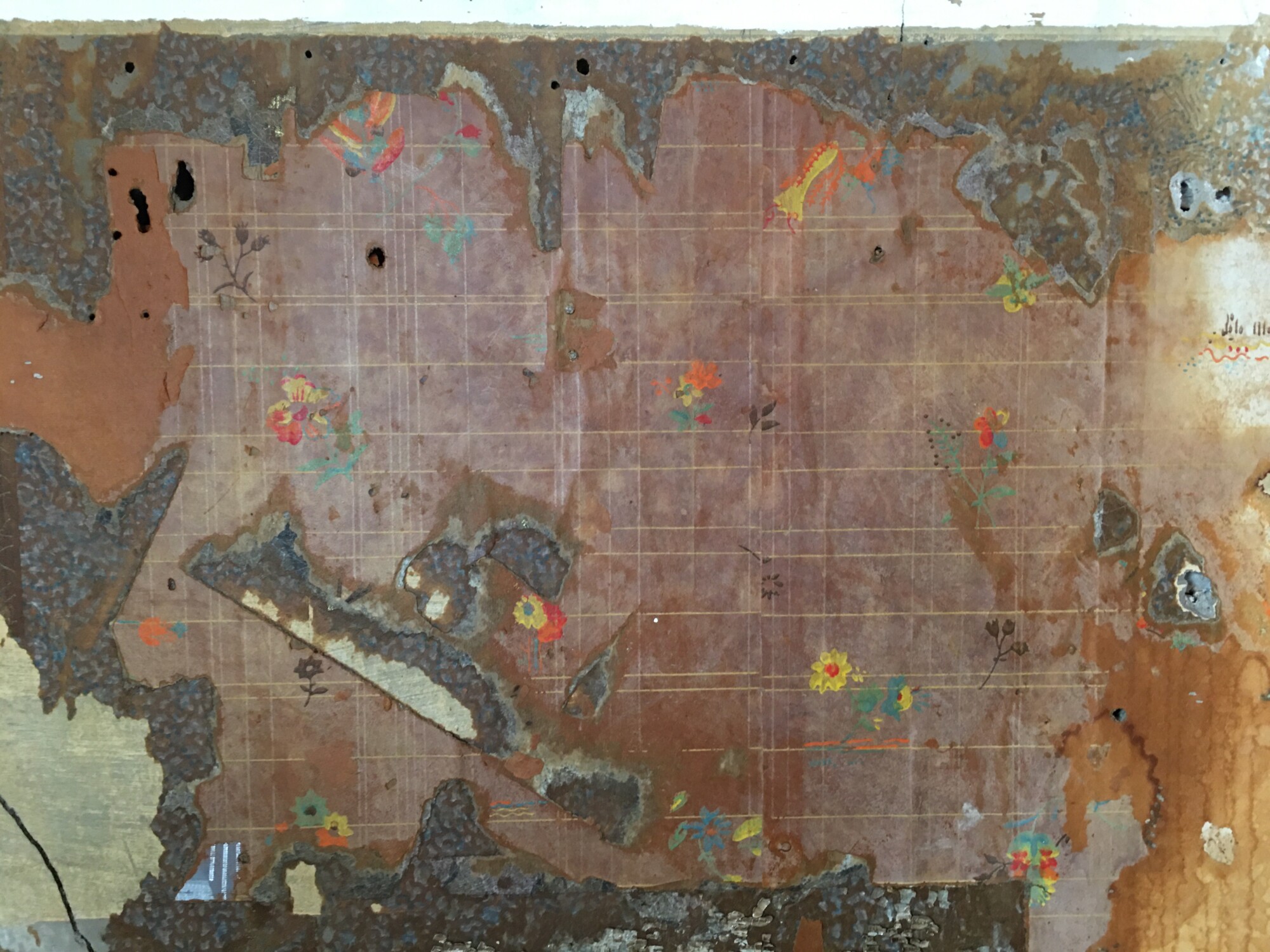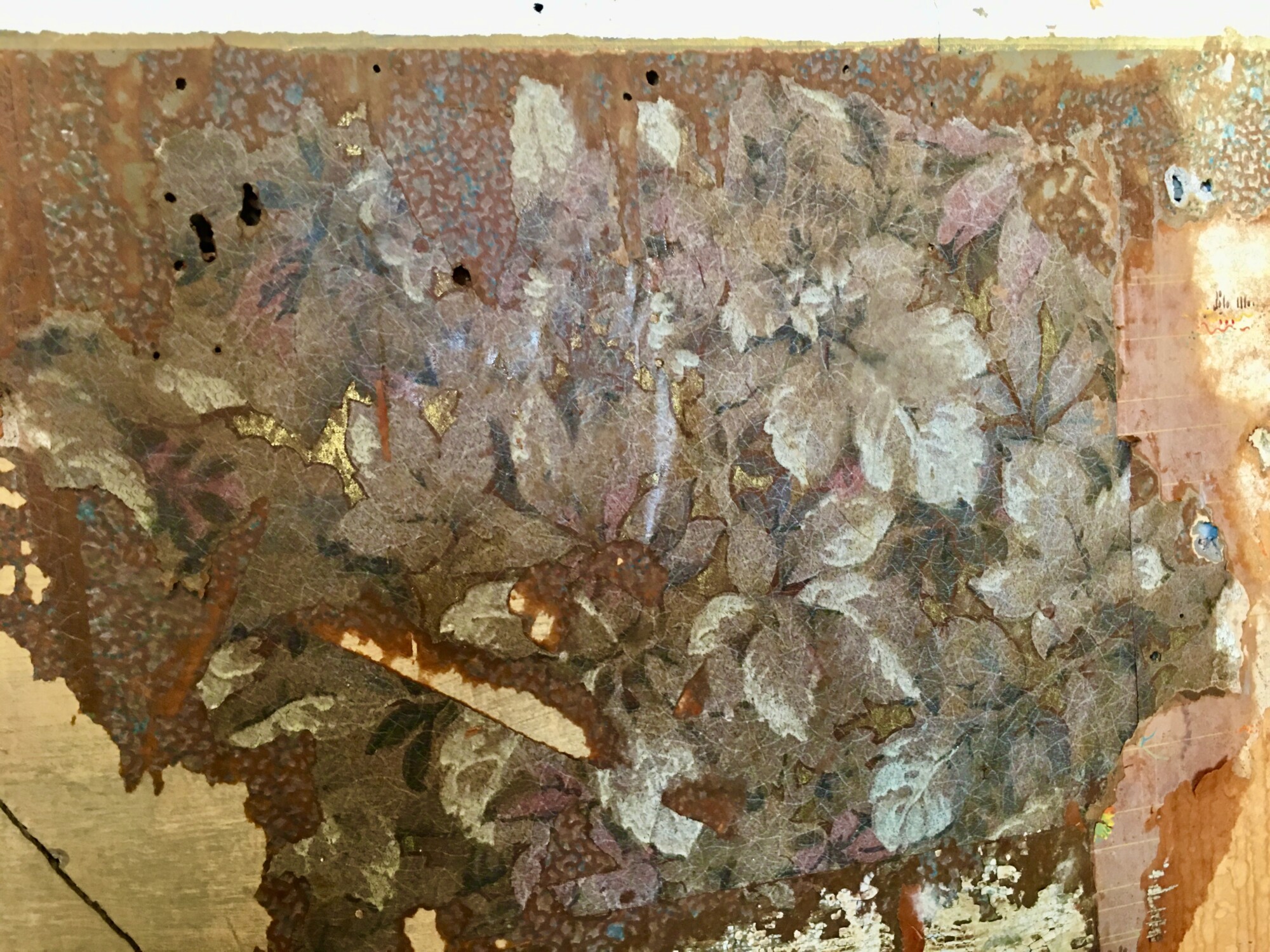 After wetting the papers, and carefully peeling away top plain paper, this was revealed. NOTE: The water has darkened all the wallpapers.