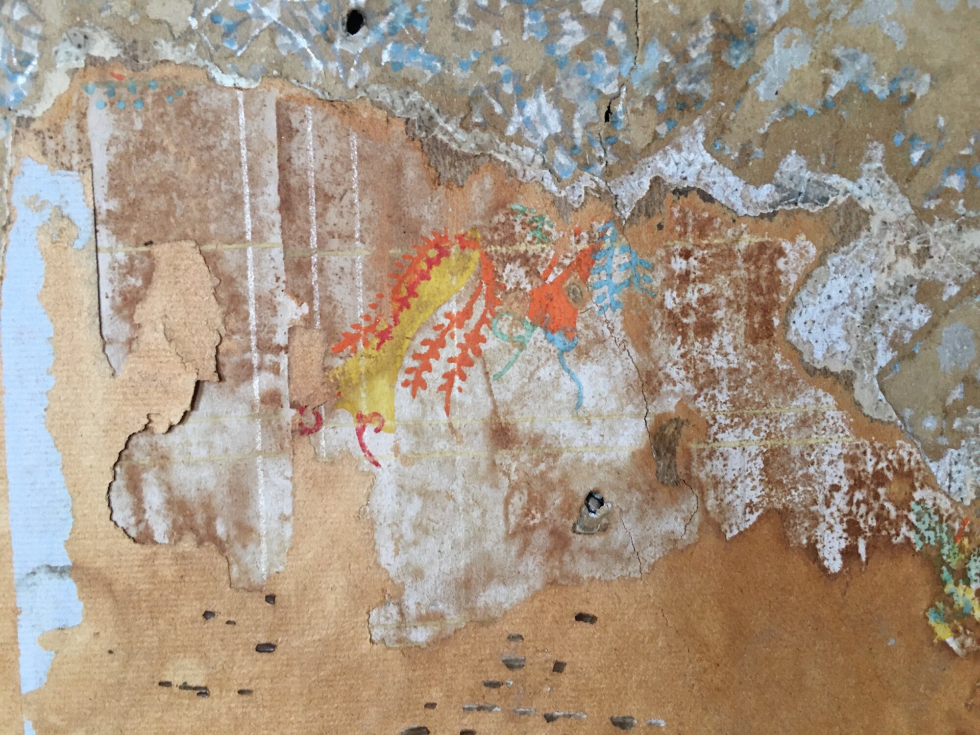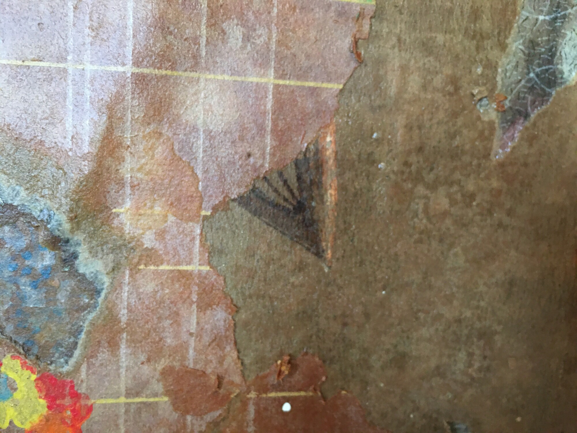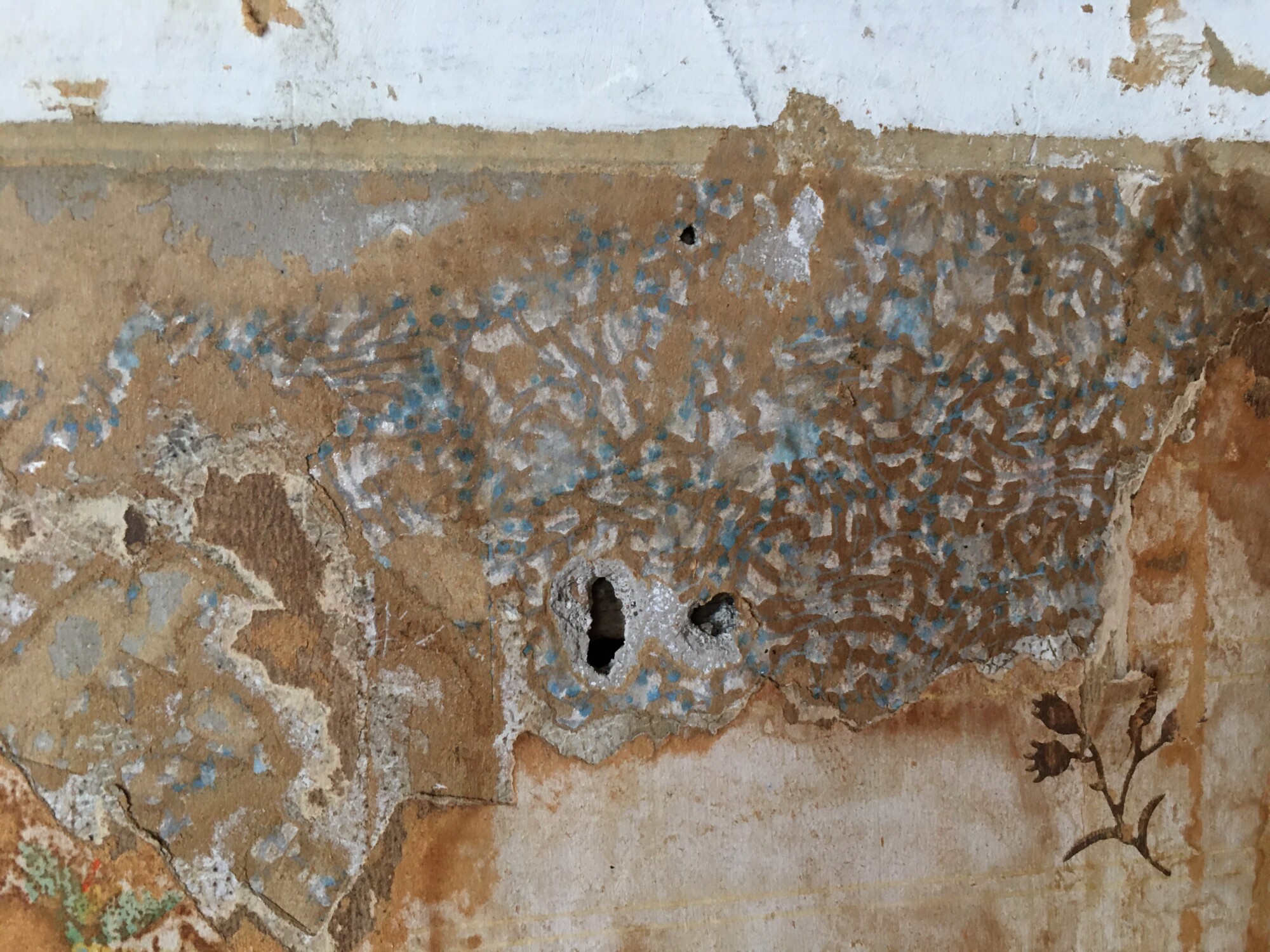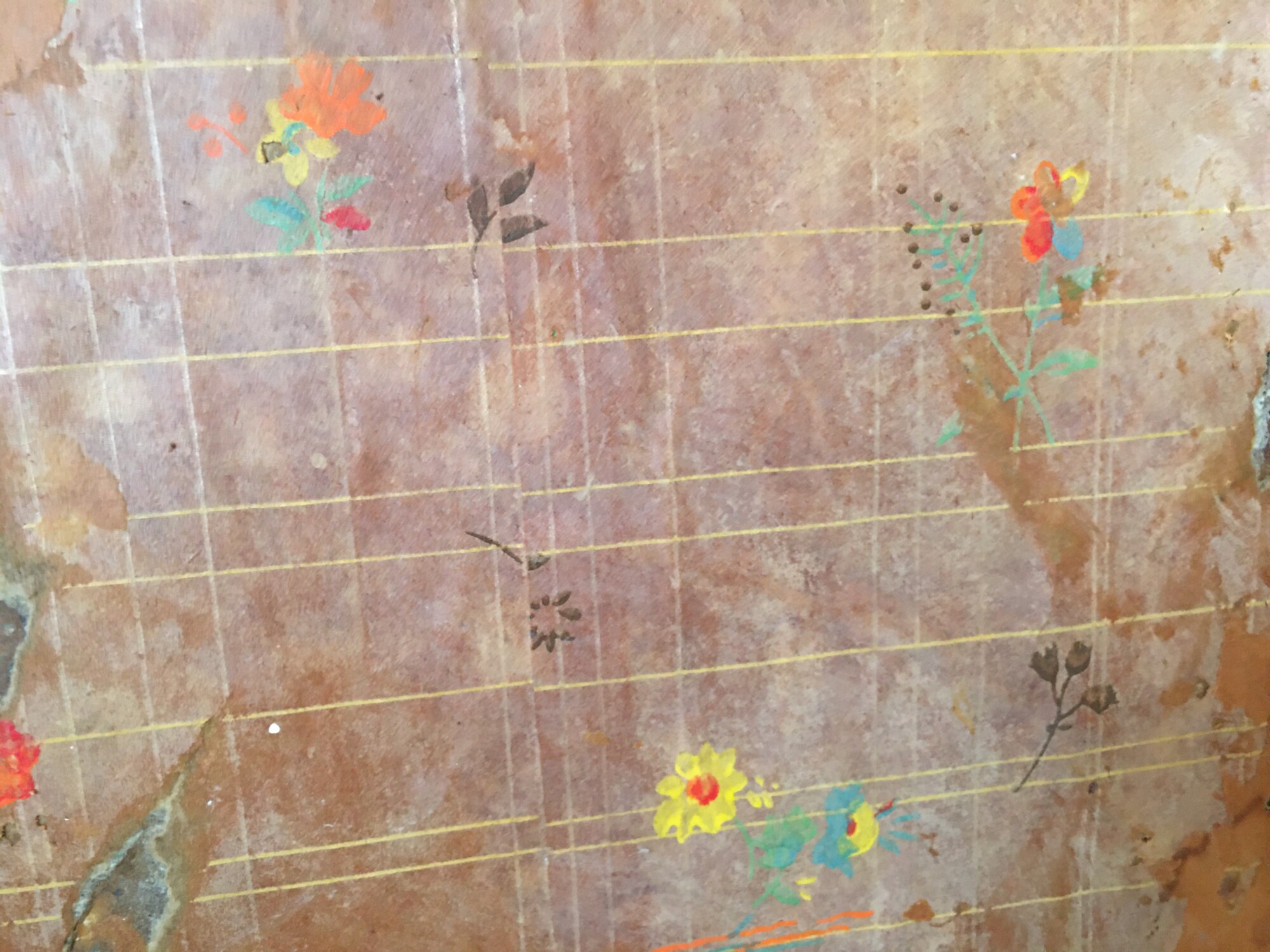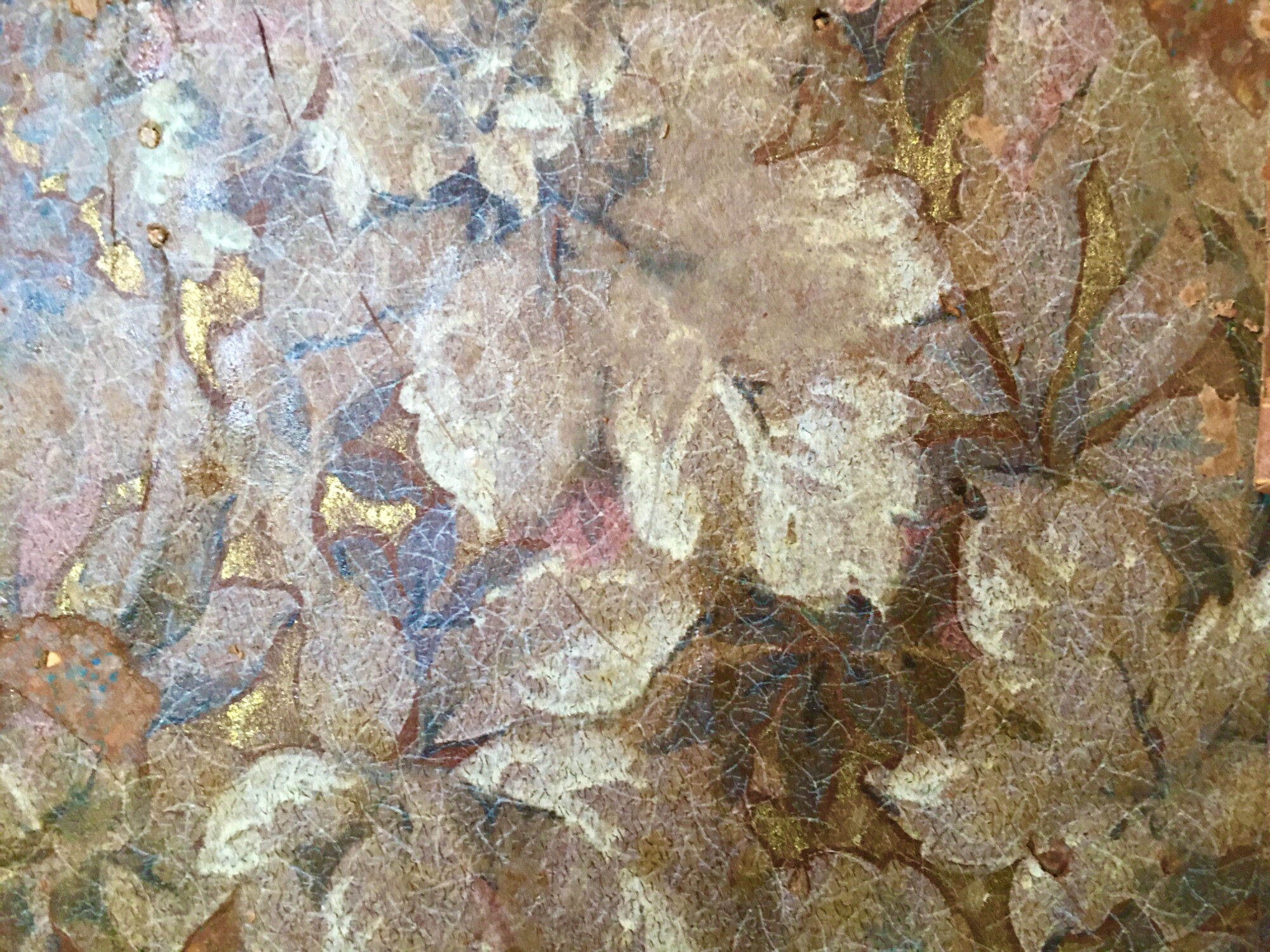 After wetting the papers, and carefully peeling away top plain paper, this was revealed. NOTE: The water has darkened all the wallpapers.