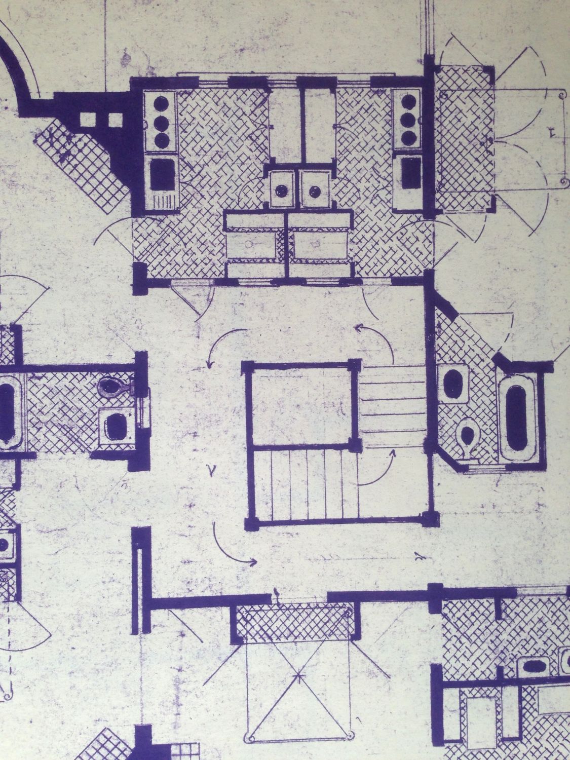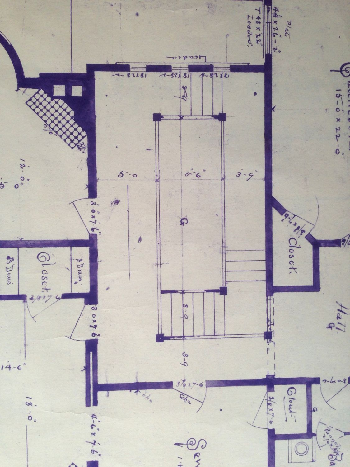 This is, I believe, a 1929 blueprint of alterations made to convert the house into apartments. The drawing shows how the original expansive stair opening was significantly shrunk to add two kitchens along the north wall.