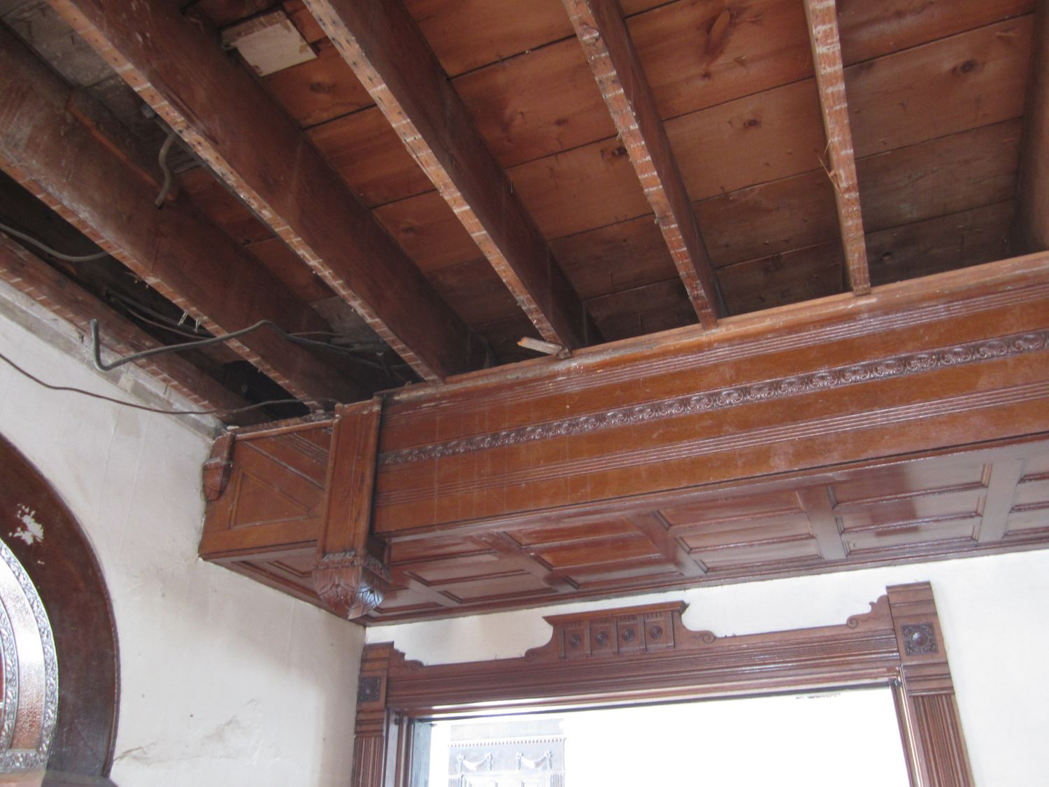 To restore the 1894 expansive opening, the 1929 ceiling under had to be removed. Of note are the lower portions of two newel posts, which had been sawed apart in 1929. At the far left you see just a bit of newel #3, kissing the wall. Adjacent, and hanging just below the 1894 landing, is newel #4.