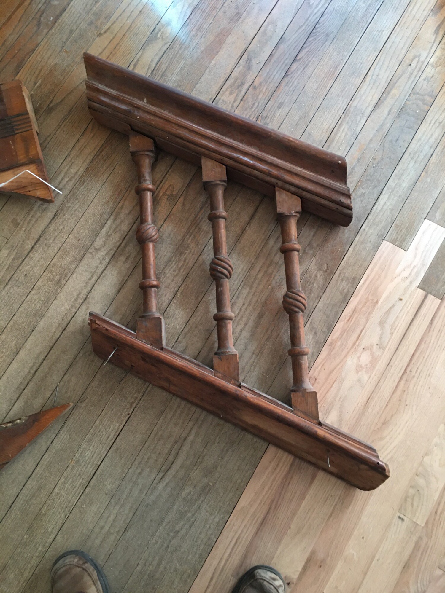 Newel #3 (left) and newel #4, no longer decapitated from their lower portions. Each, of course, needs to be repaired. The newels are different heights because three steps were adjacent, going from the intermediate landing (right) to the second floor (left). This means that the railing would be an angle.