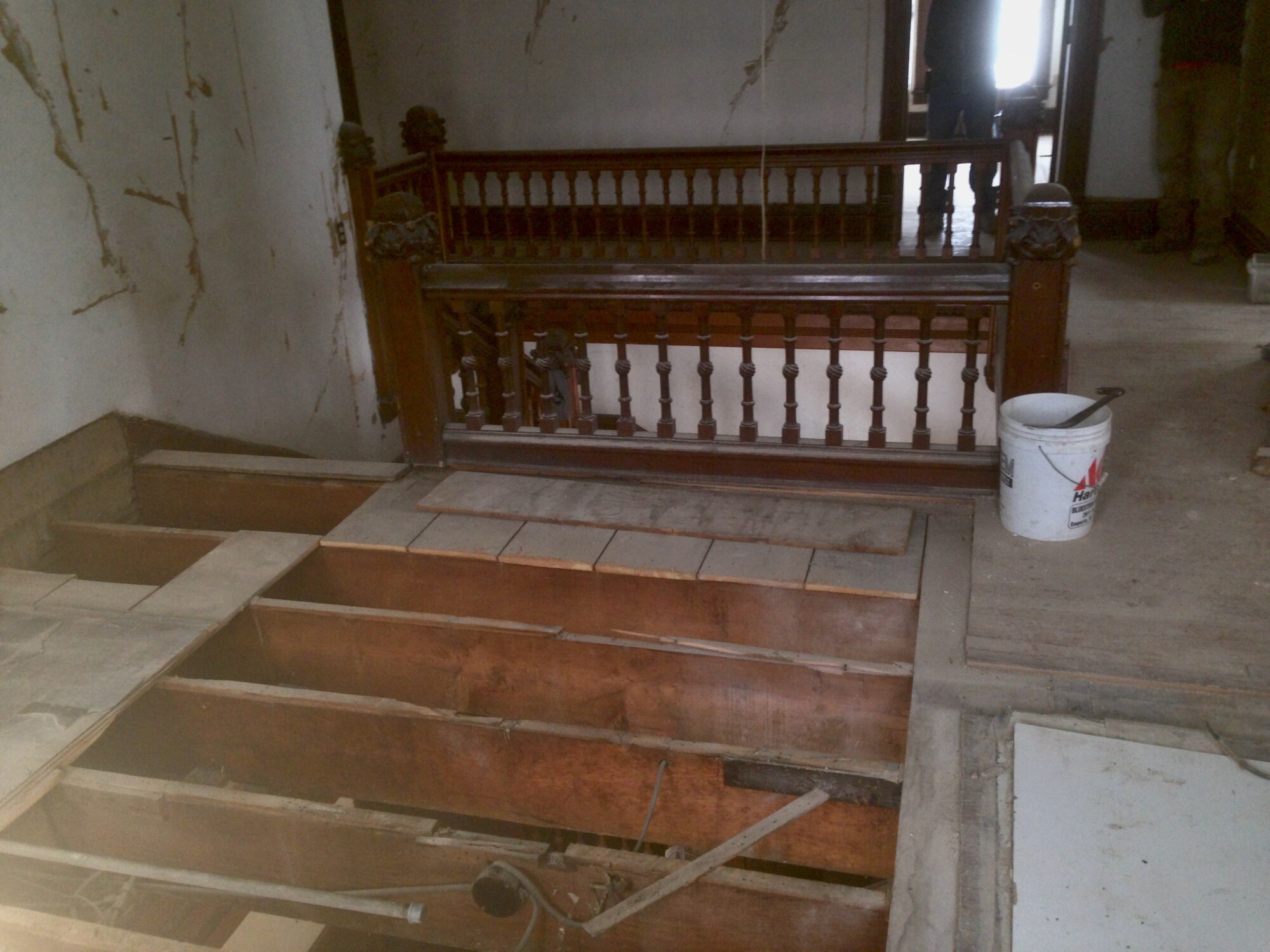 While light has now returned, the expansive opening is still half what it was in 1894. Here, Justin and Scott begin the process of removing the infill flooring.