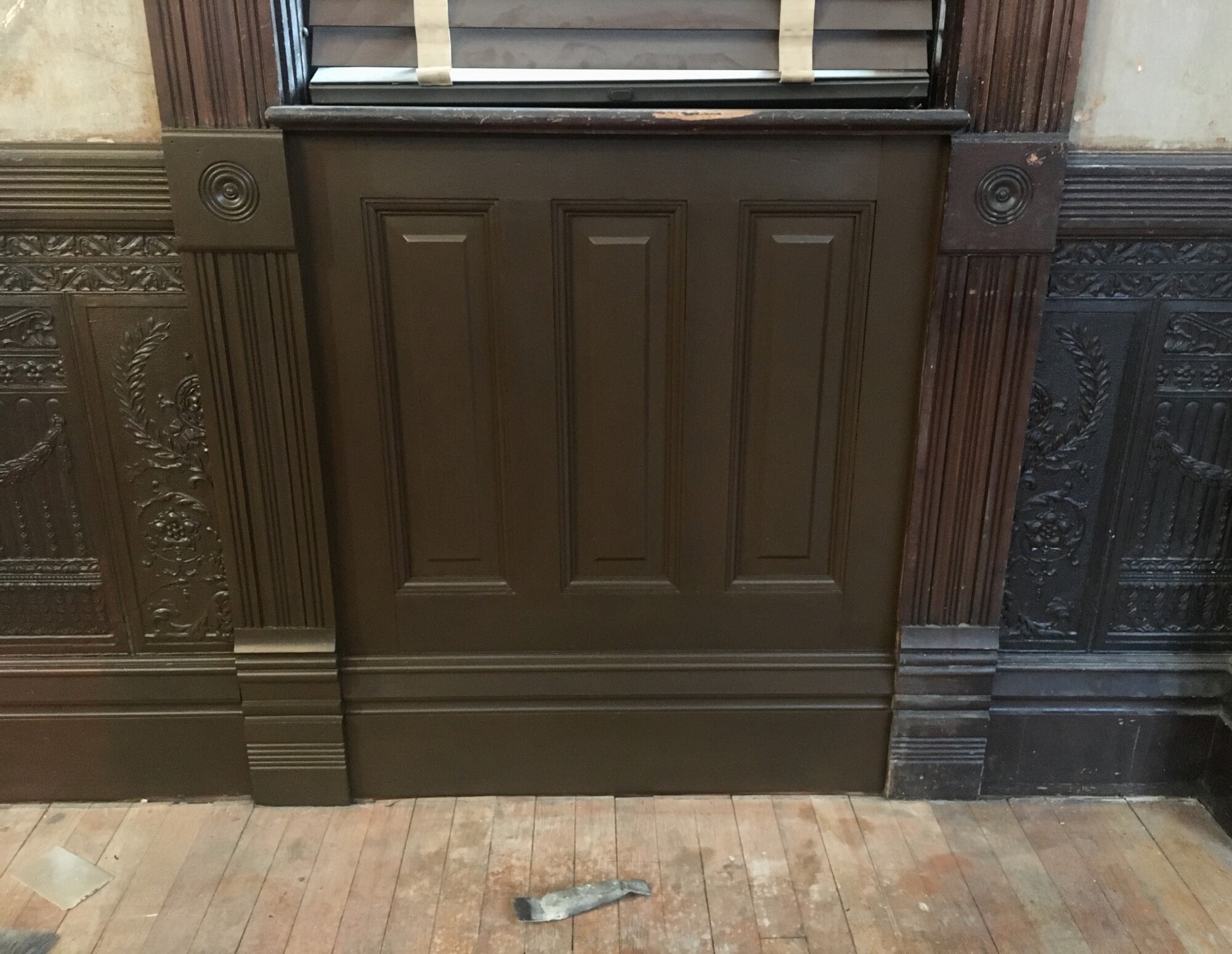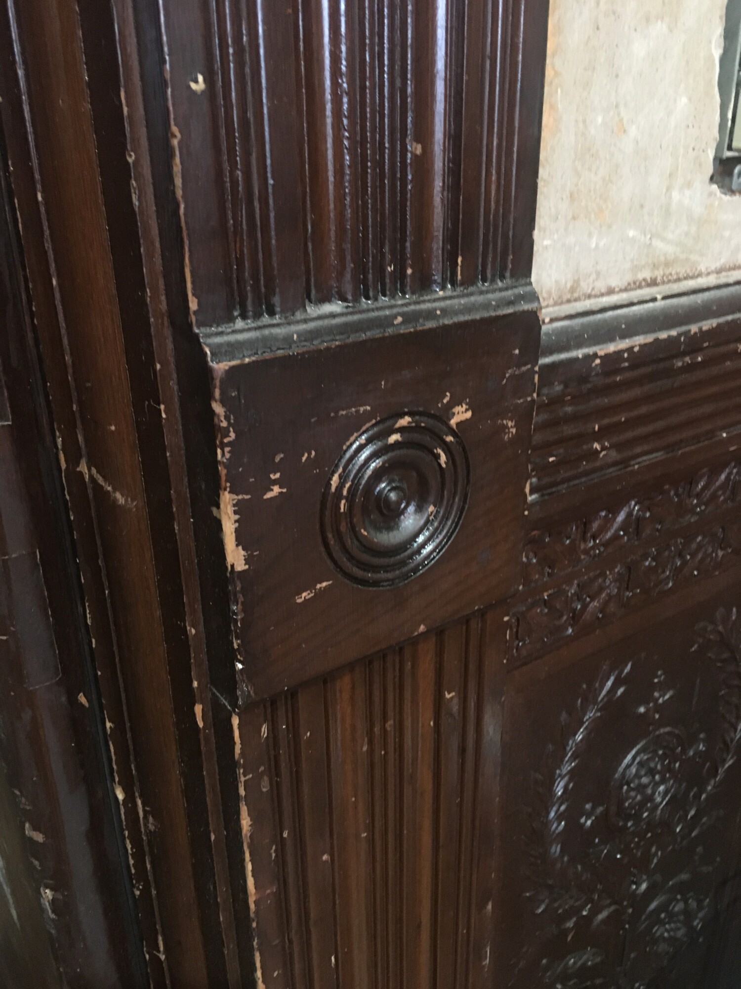 This panel is under the west window. I was able to remove the mystery layer, revealing the 1894 faux bois finish. But…it looks like hell. A person who is skilled at faux bond finishes could likely restore all the damage but the work is not something I can do.