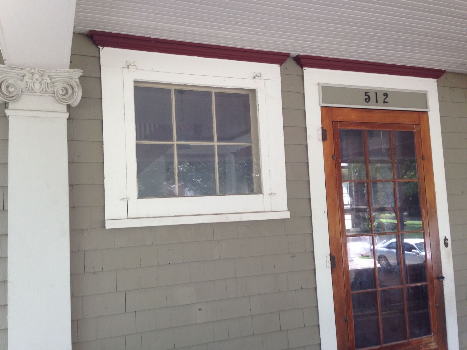 The screen door is vintage but not original and thus not tall enough. I would remove it, and the piece of wood above with the house numbers. Why? Because…