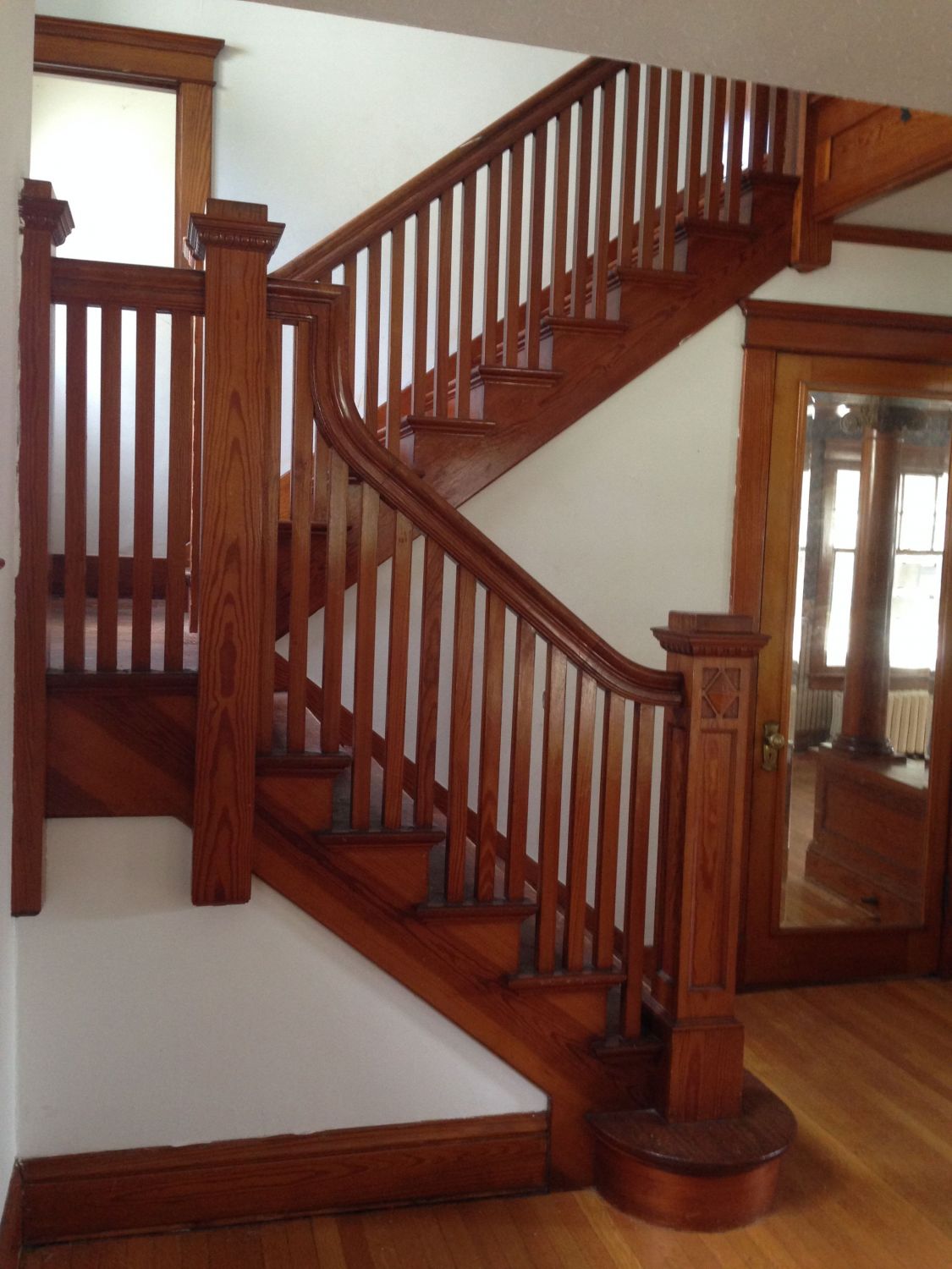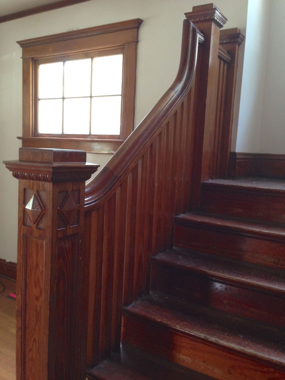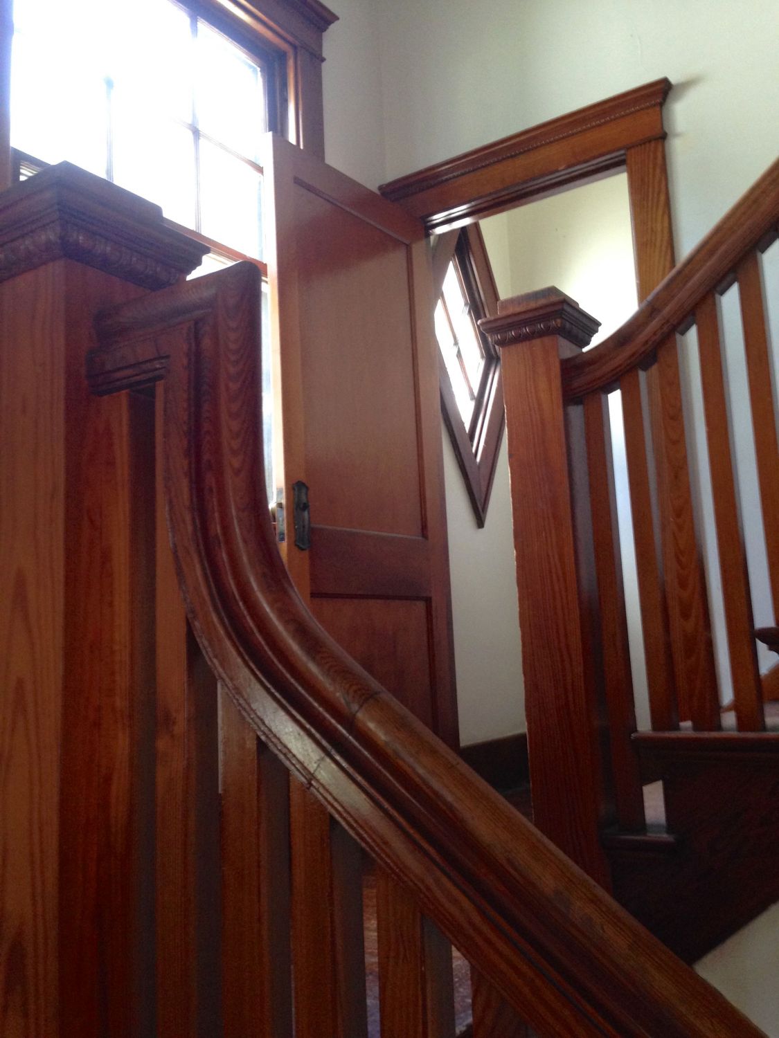 Back in the entry hall, and headed up the stairs. Note the diamond window through the door. The servant’s half stair opens to this landing.