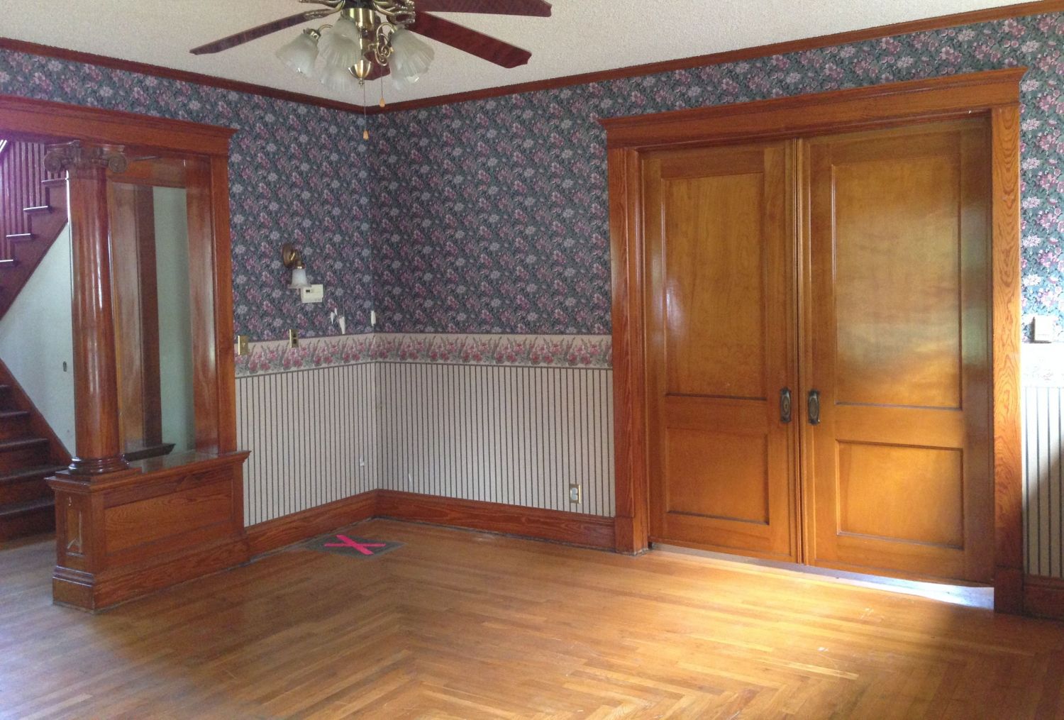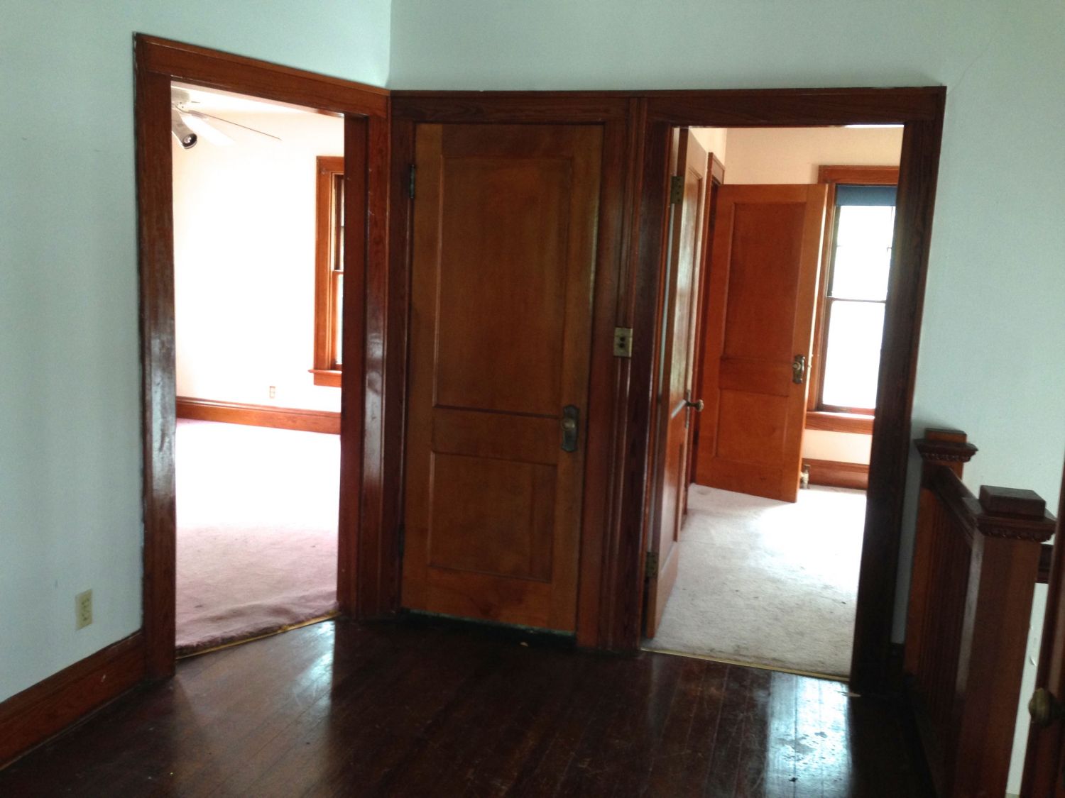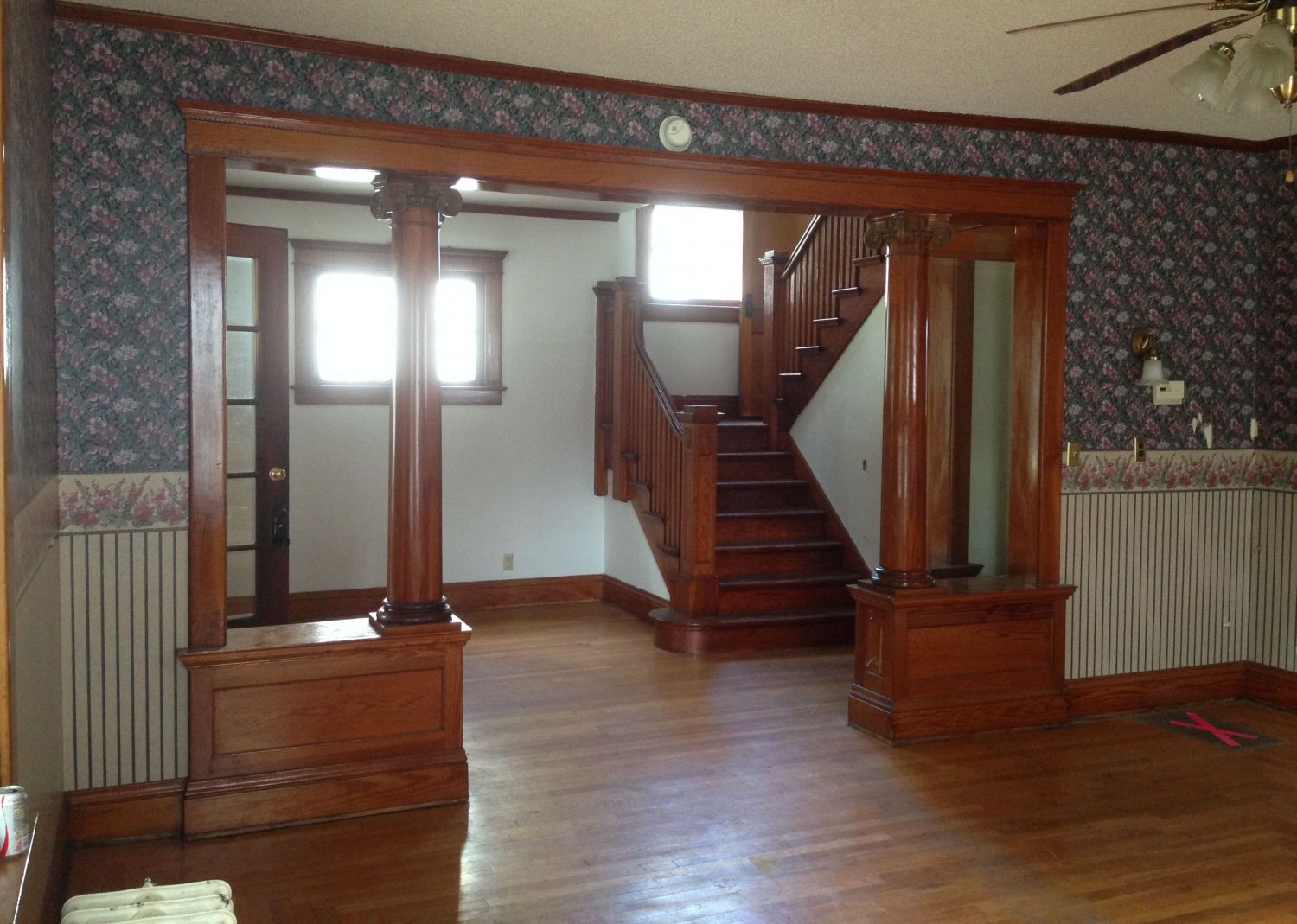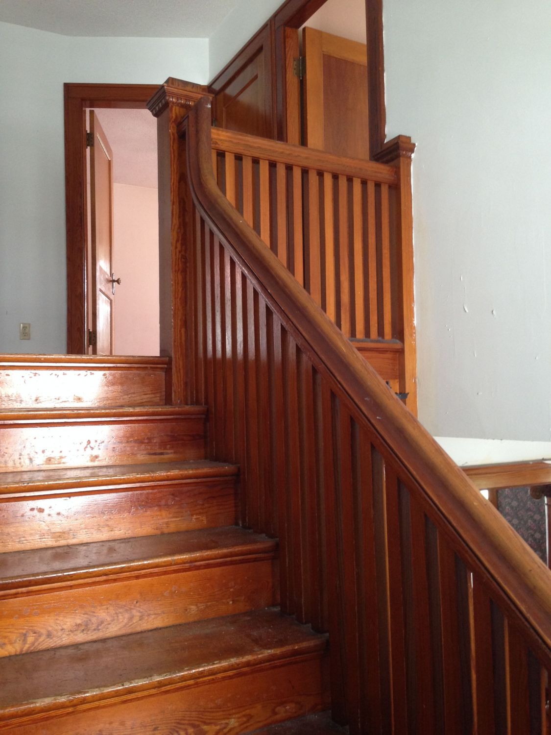 Back in the entry hall, and headed up the stairs. Note the diamond window through the door. The servant’s half stair opens to this landing.